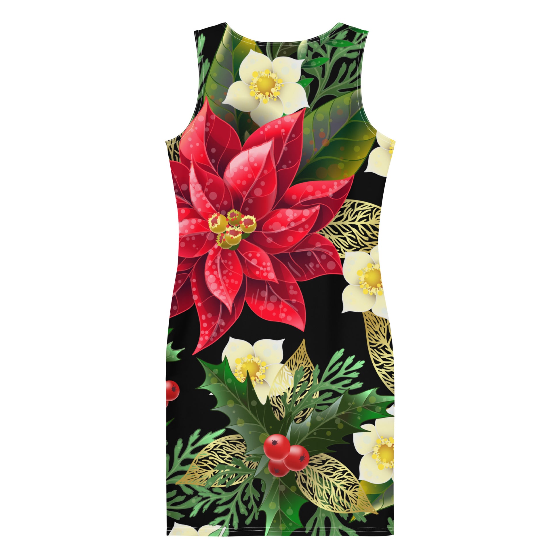 Featuring an oversized Poinsettia and holly all-over print, a smooth stretch polyester and spandex blend fabric, a scoop neck collar, no sleeves, a body contouring fit and it comes unlined.