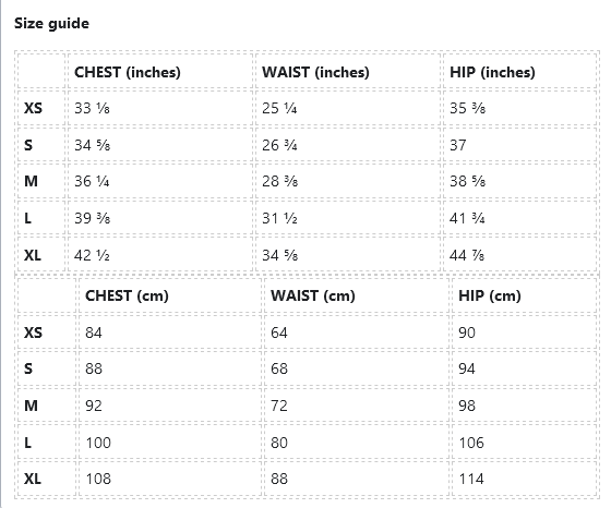 | XS | 33 ⅛ | 25 ¼ | 35 ⅜ |