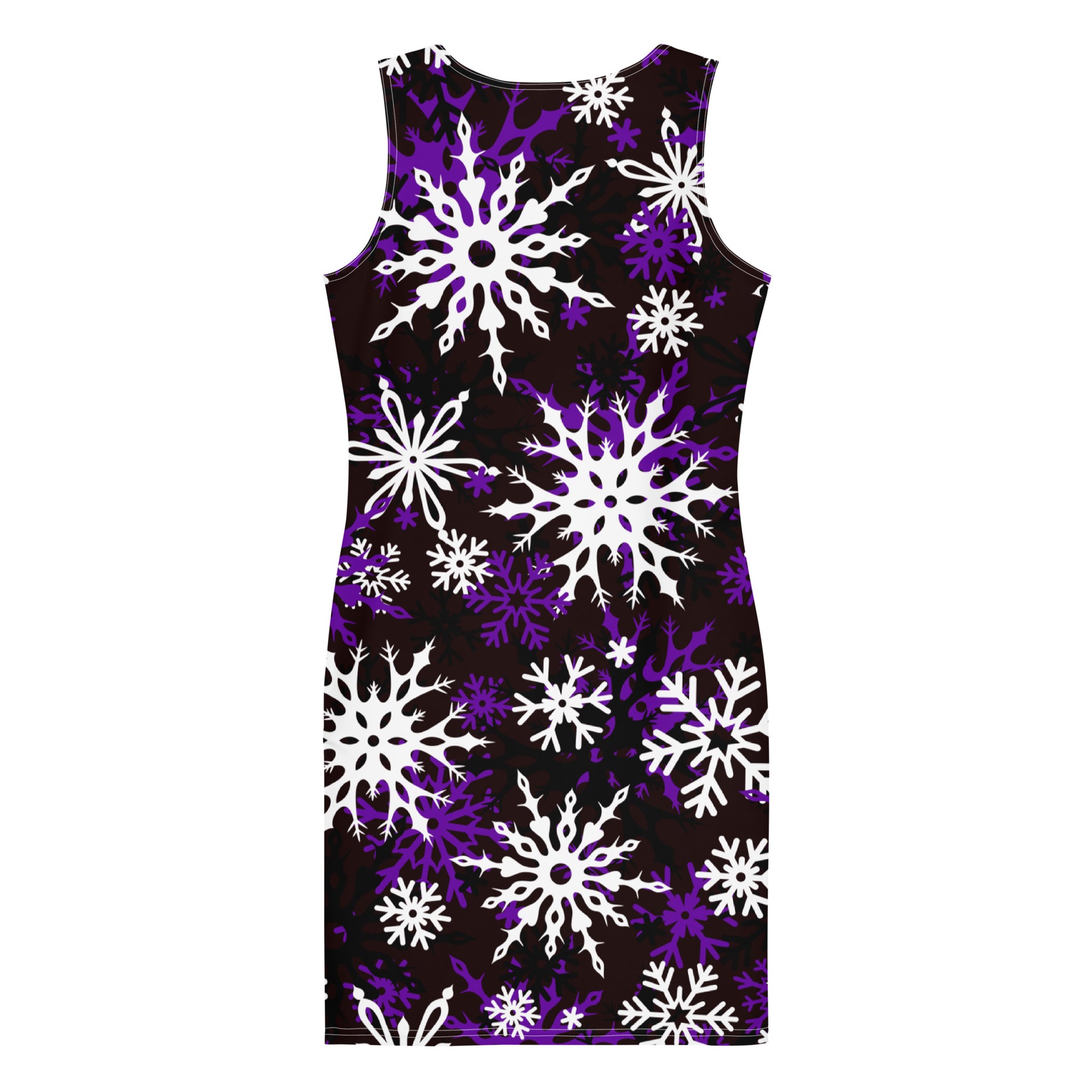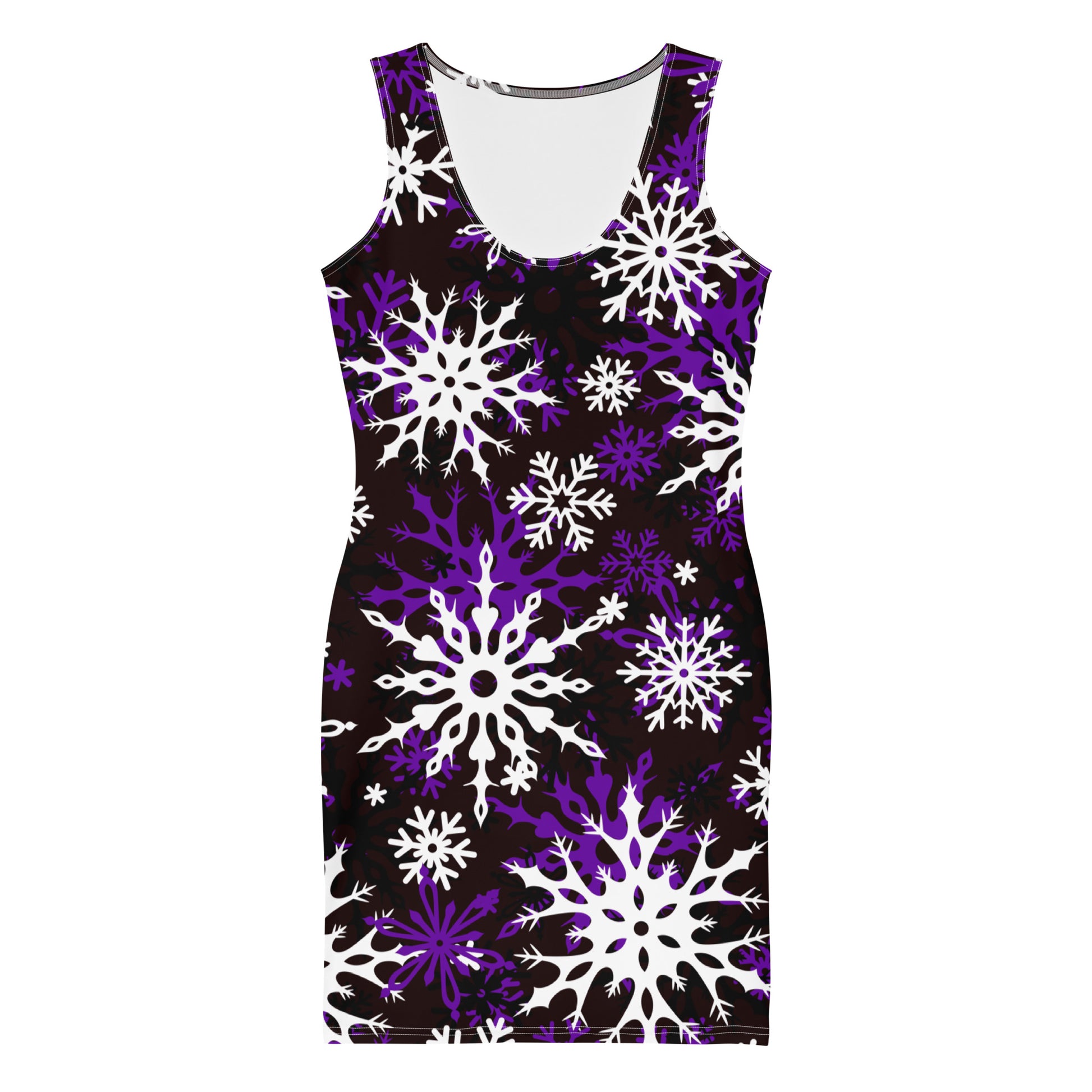 Featuring an oversized snowflake all-over print, a smooth stretch polyester and spandex blend fabric, a scoop neck collar, no sleeves, a body contouring fit and it comes unlined.