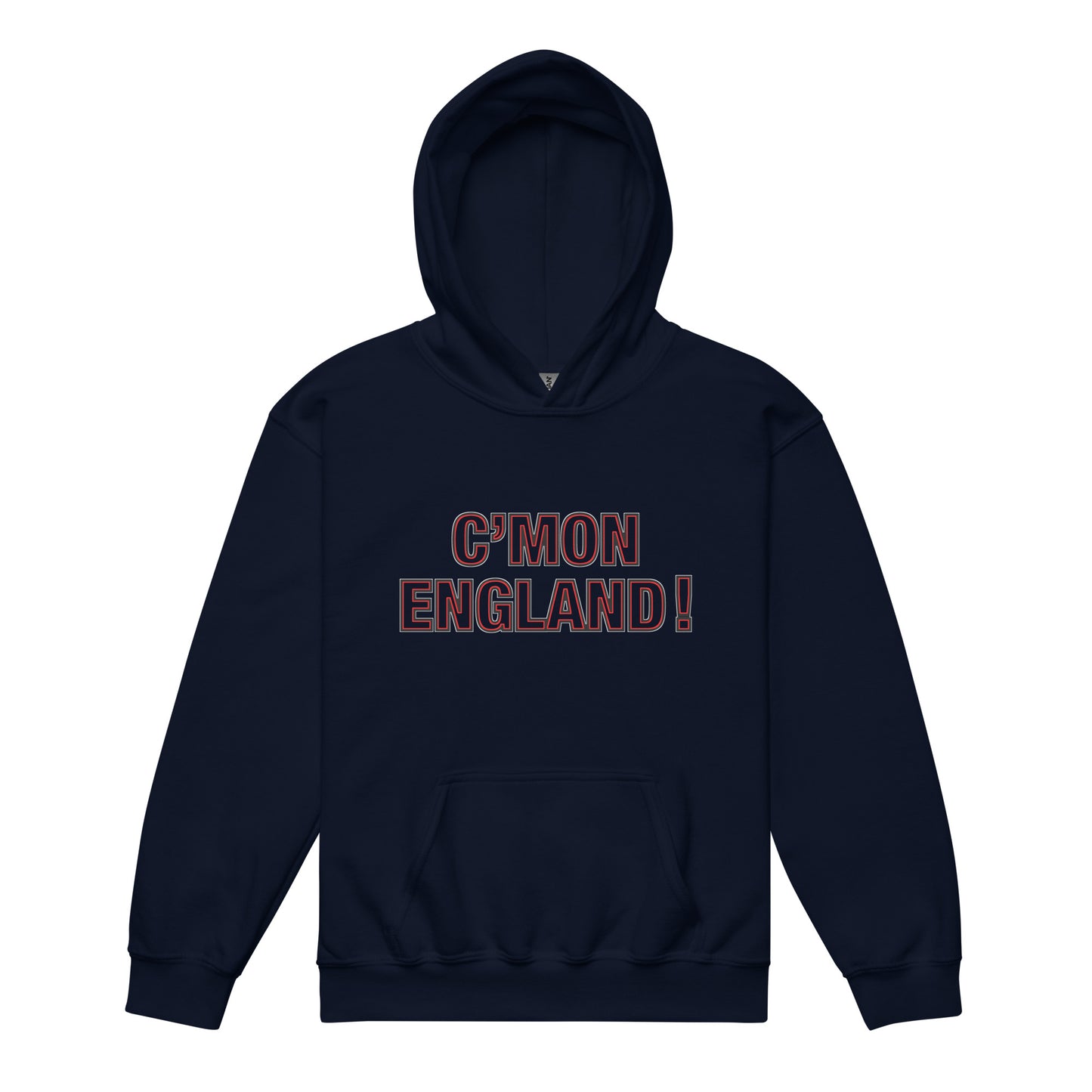 This unisex cotton Euro 2024 Football Tournament themed hoodie for boys and girls features a 'C'mon England!' slogan with a cutout red and white neon lettering design which takes on the exact colour of the hoodie, whichever that colour may be.