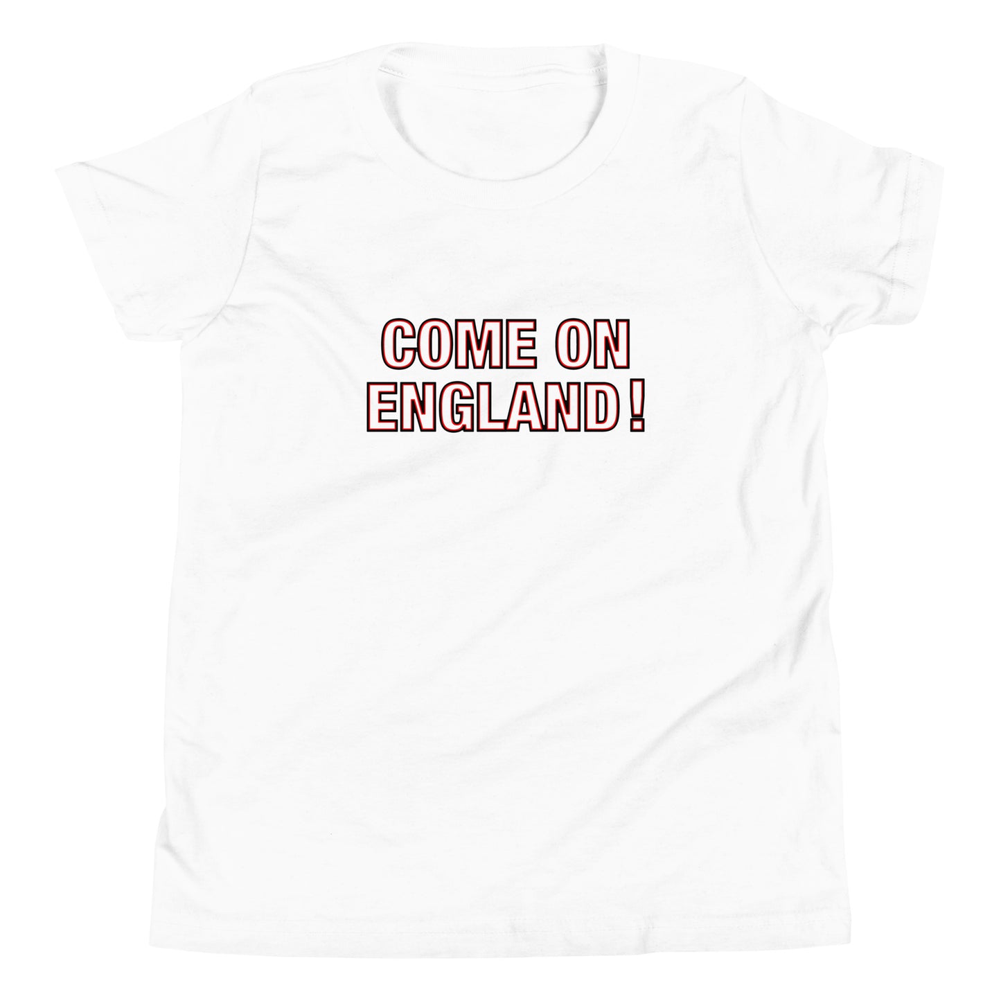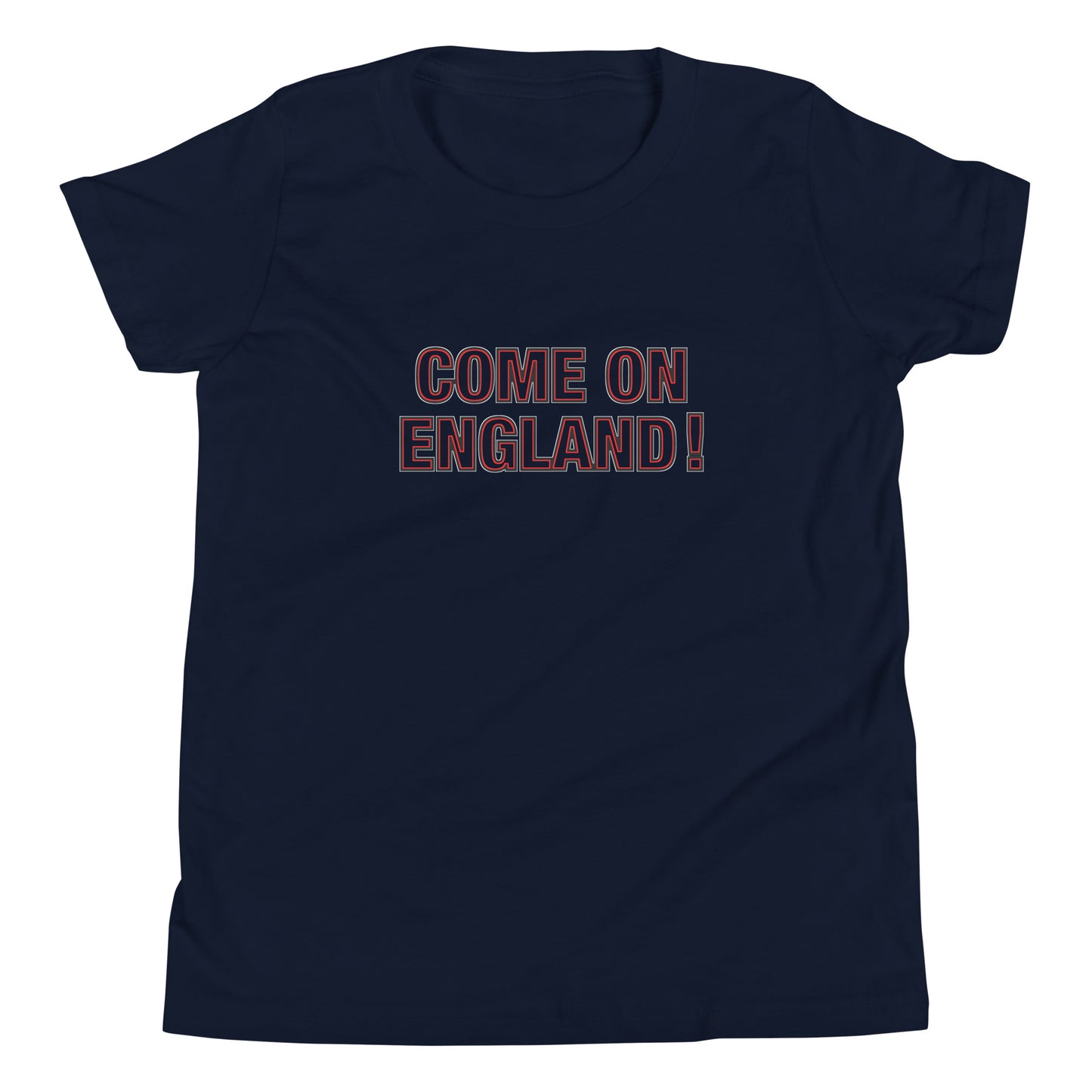This unisex cotton Euro 2024 Football Tournament themed t-shirt for boys and girls features a 'Come On England!' slogan with a cutout red and white neon lettering design which takes on the exact colour of the t-shirt, whichever that colour may be.