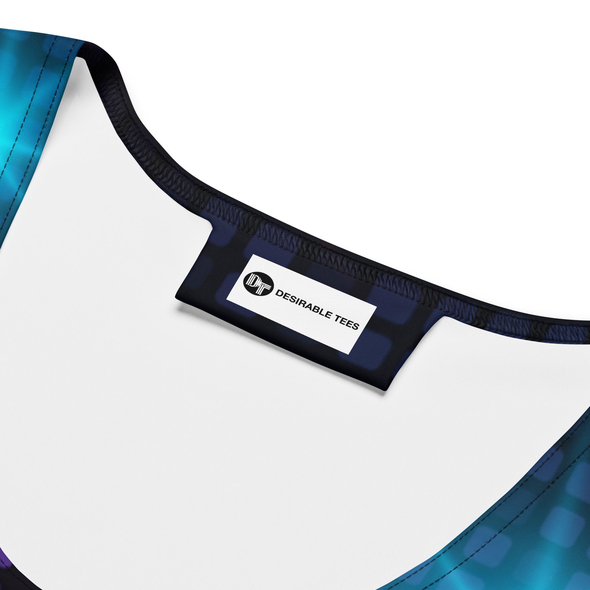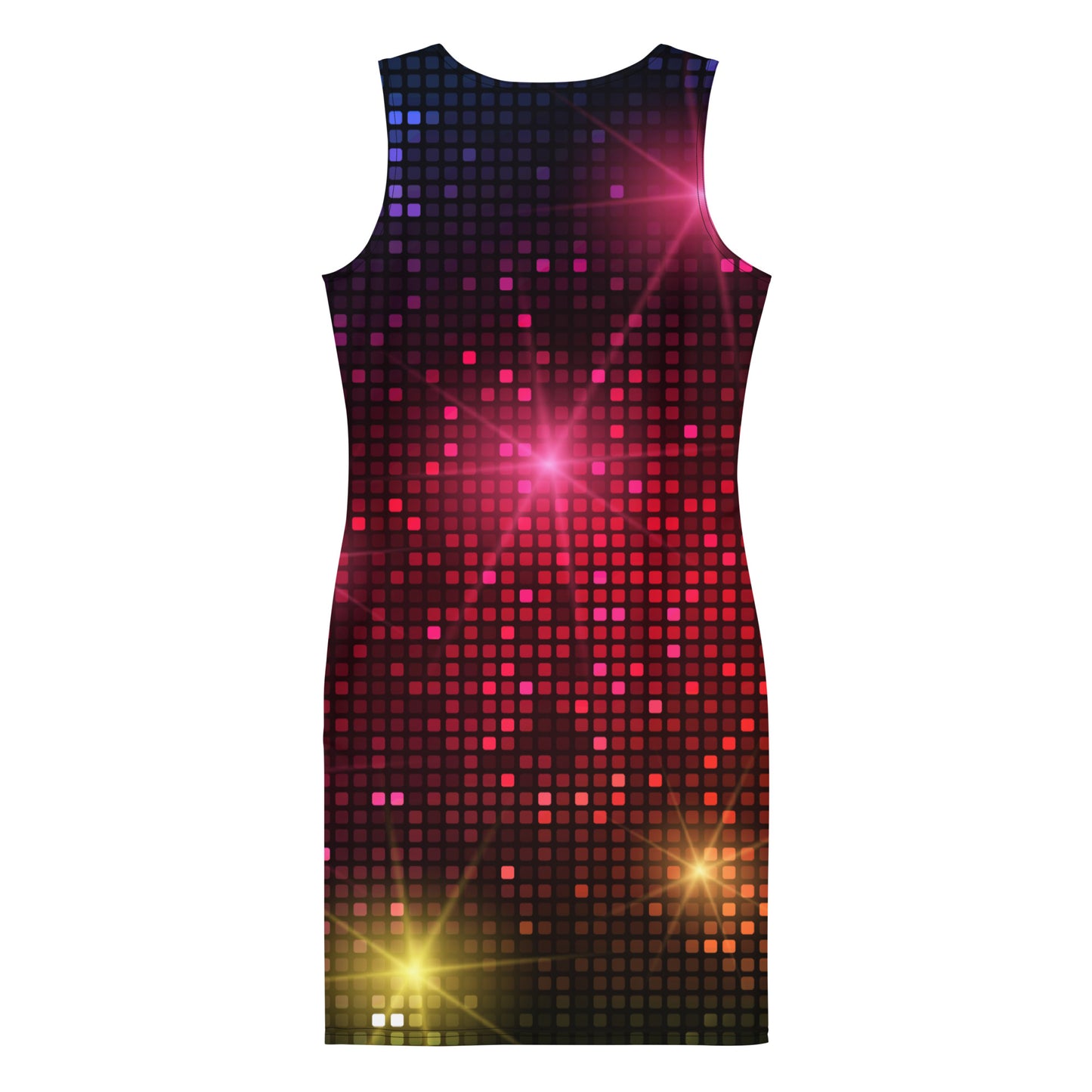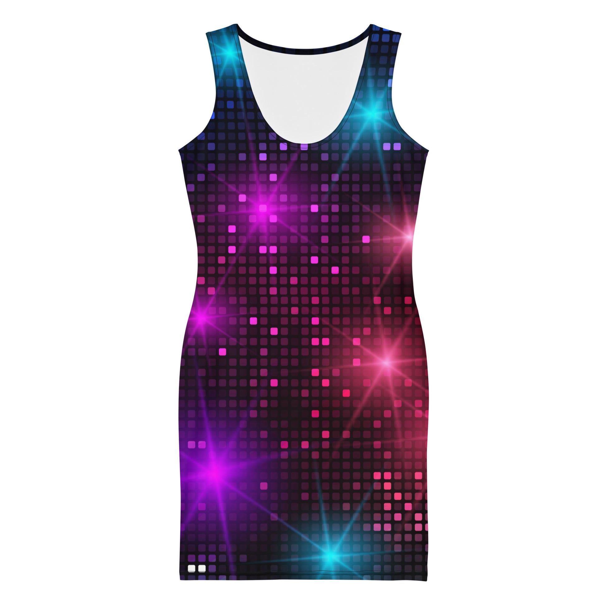 Featuring a multicoloured sparkling disco and party lights all-over print, a smooth stretch polyester and spandex blend fabric, a scoop neck collar, no sleeves, a body contouring fit and it comes unlined.