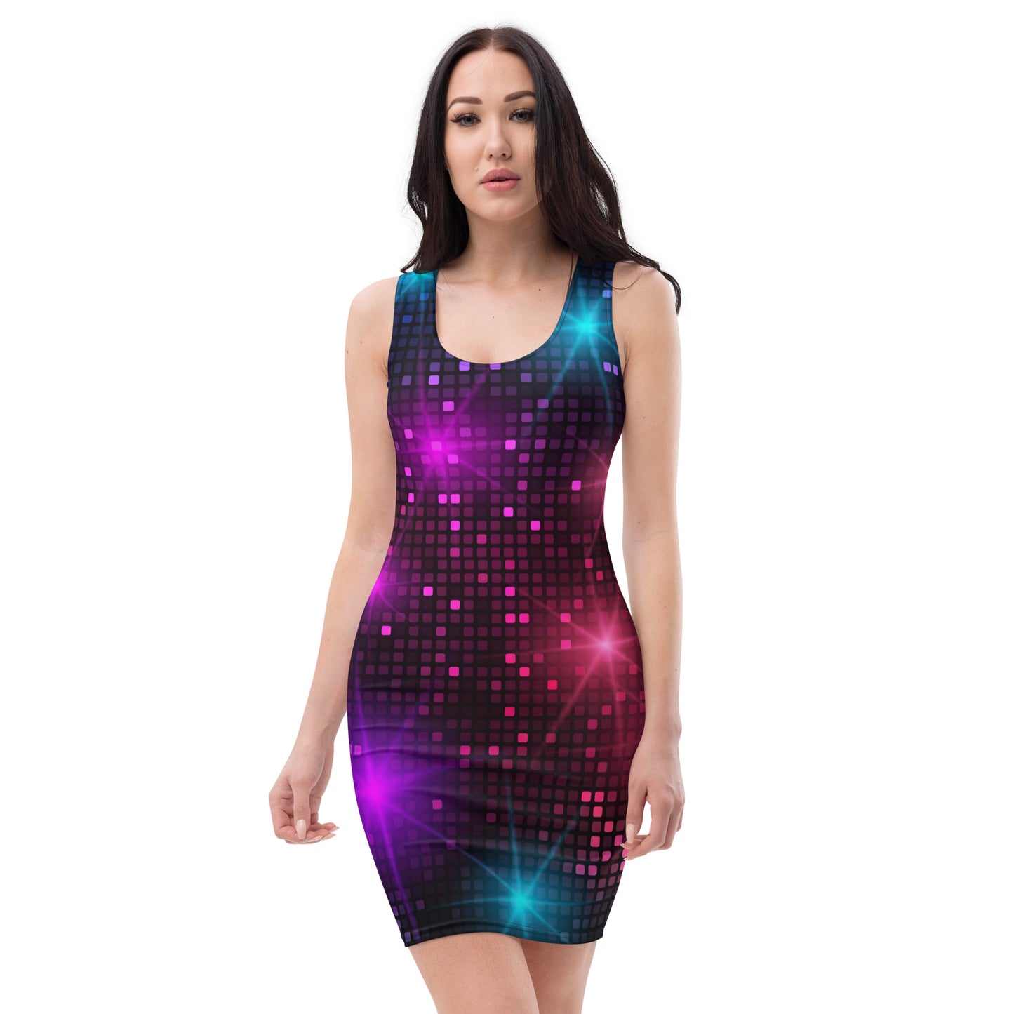 Girls, for those disco nights and party lights, make a statement and look absolutely fabulous in this multicoloured all-over printed, stretch and fitted dress from Desirable Tees that is guaranteed to turn heads.