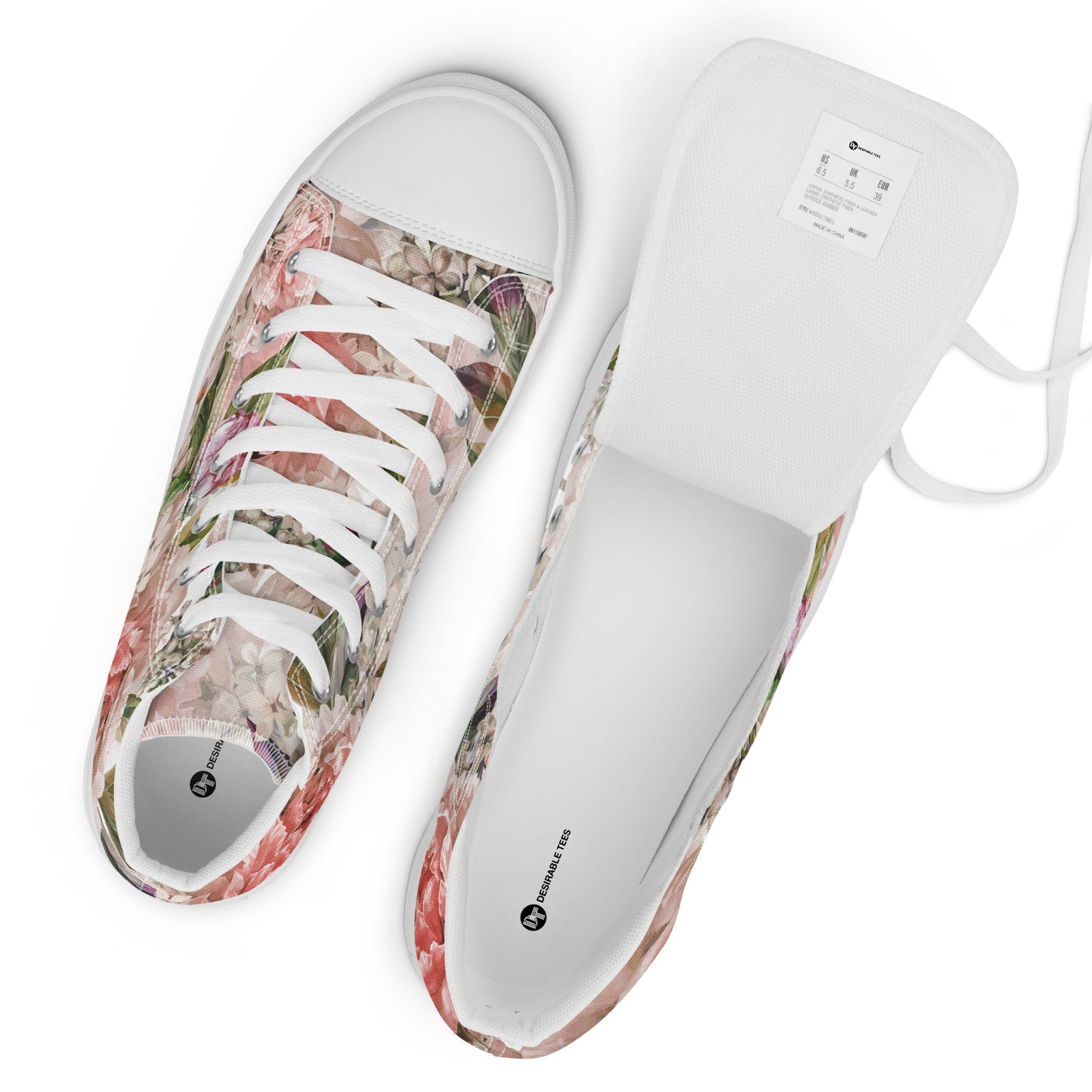 Enrich your wardrobe and step up your game with these handmade and multicoloured floral printed women's hi-top canvas trainers from Desirable Tees that are guaranteed to turn heads.