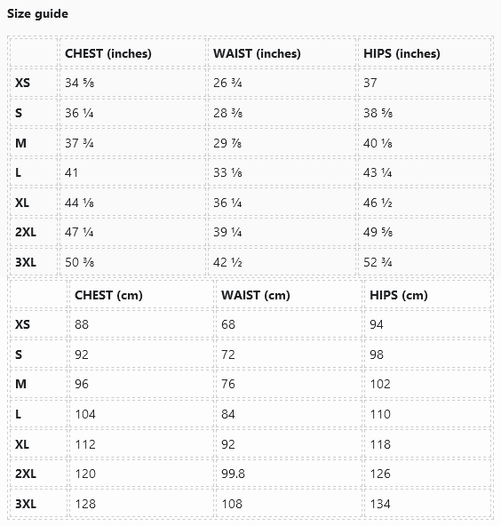 | CHEST (inches) | WAIST (inches) | HIPS (inches) | |