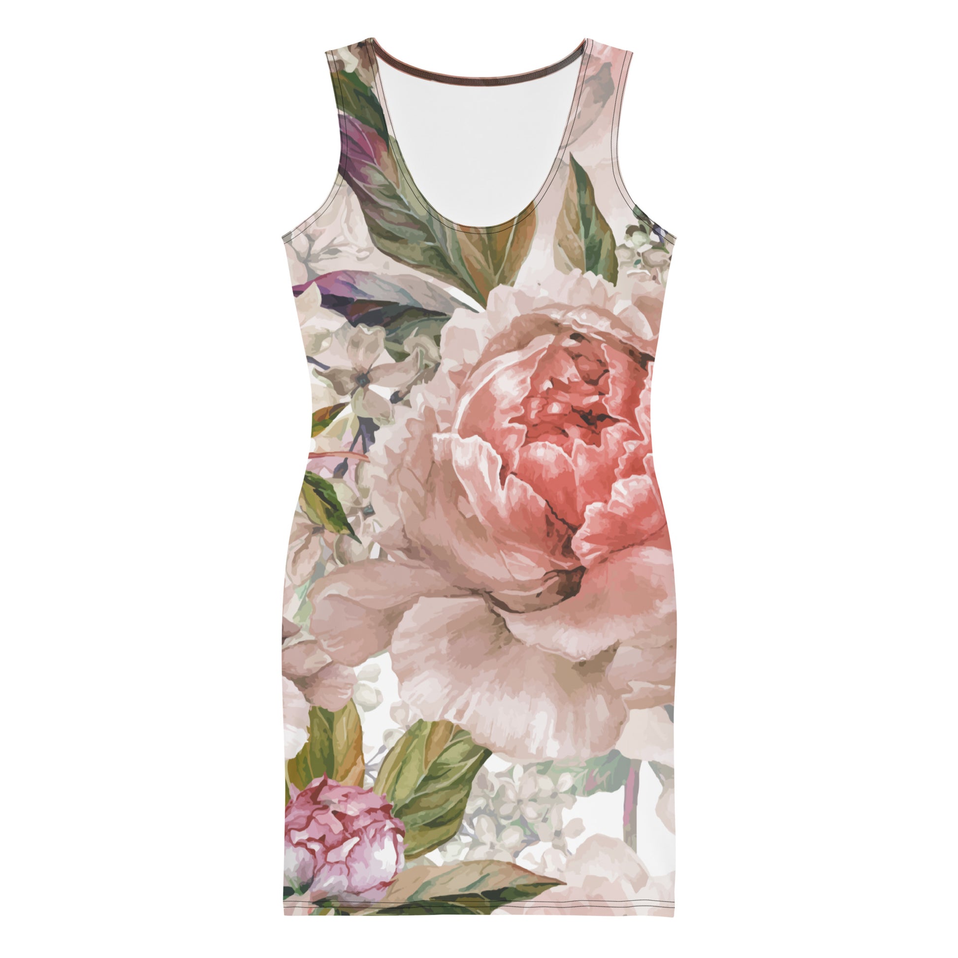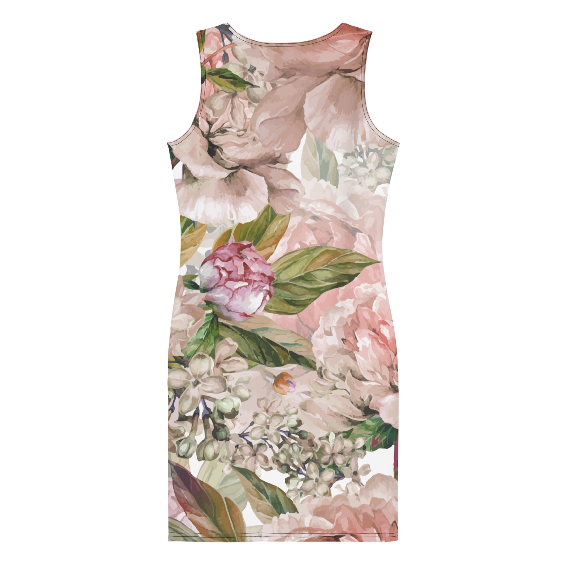 Featuring an oversized floral all-over print, a smooth stretch polyester and spandex blend fabric, a scoop neck collar, no sleeves, a body contouring fit and it comes unlined.
