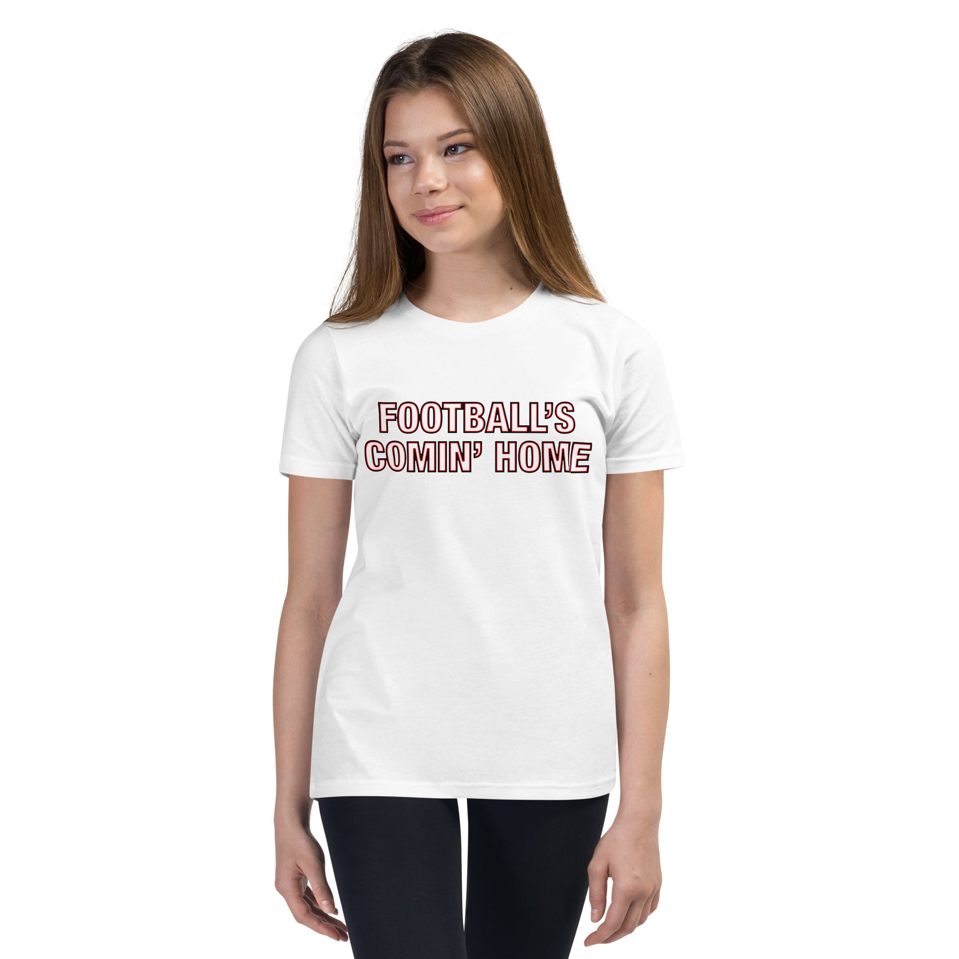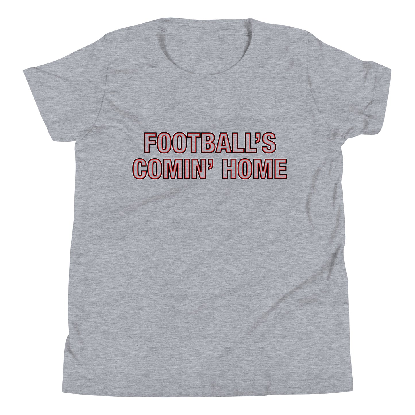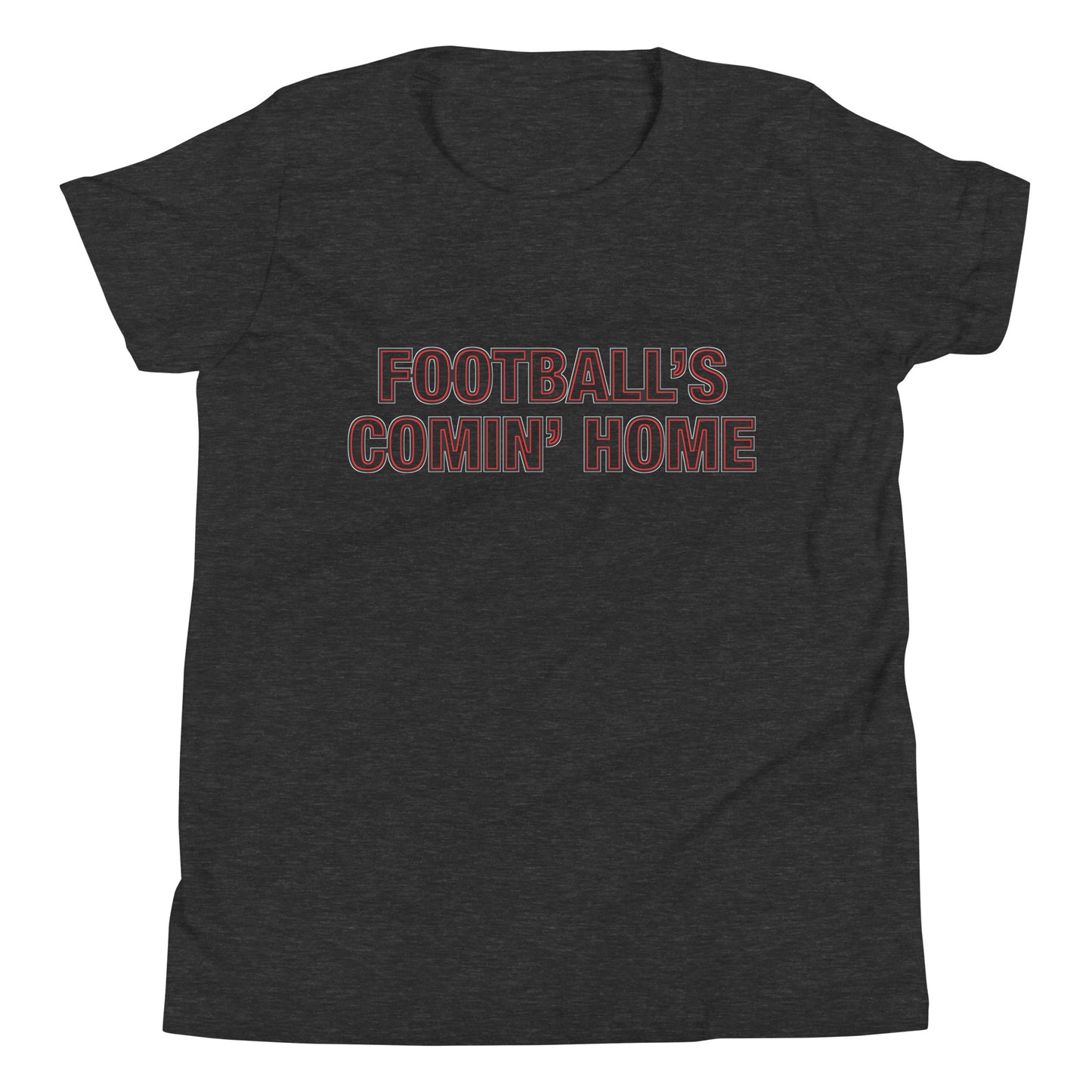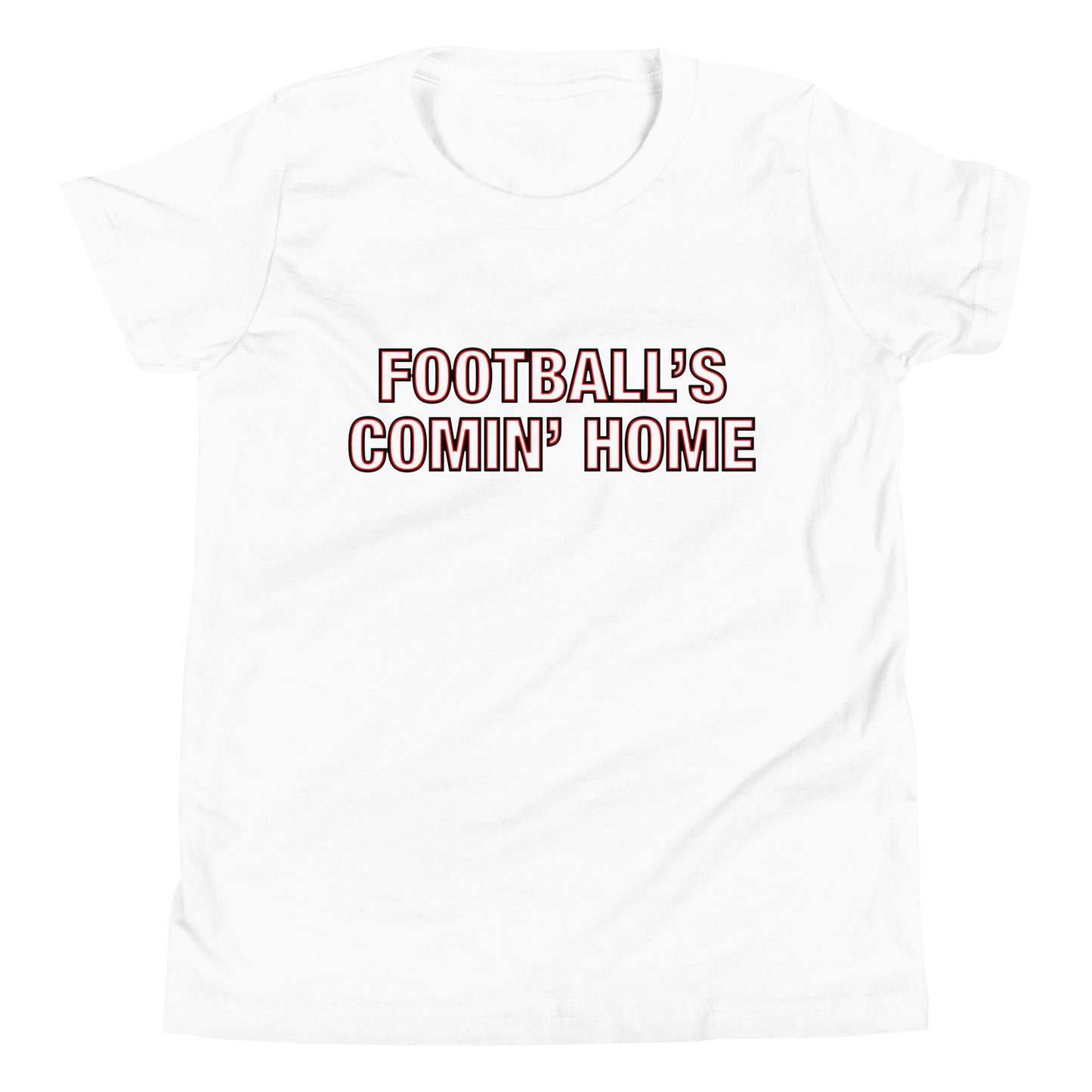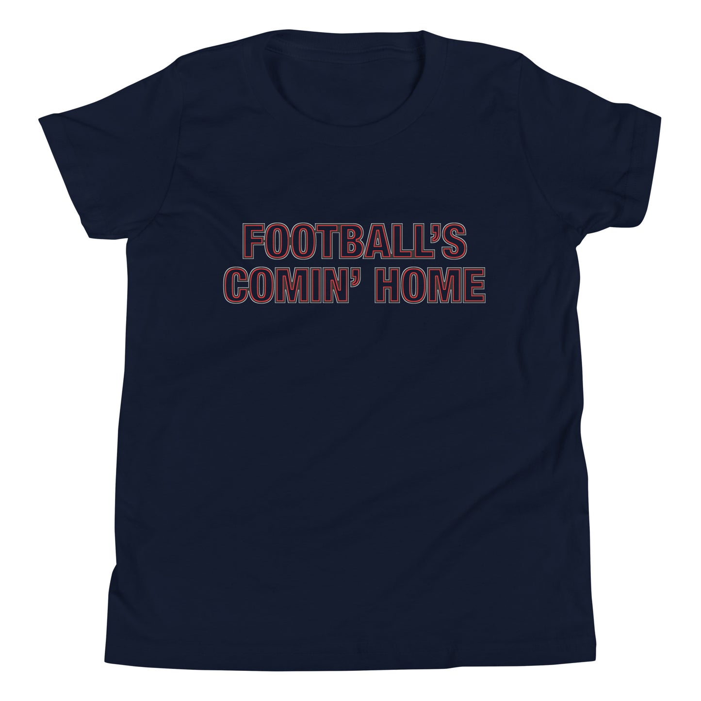 This unisex cotton England Euro 2024 Football Tournament themed t-shirt for boys and girls features a 'Football's Comin' Home' slogan with a cutout red and white neon lettering design which takes on the exact colour of the t-shirt, whichever that colour may be.