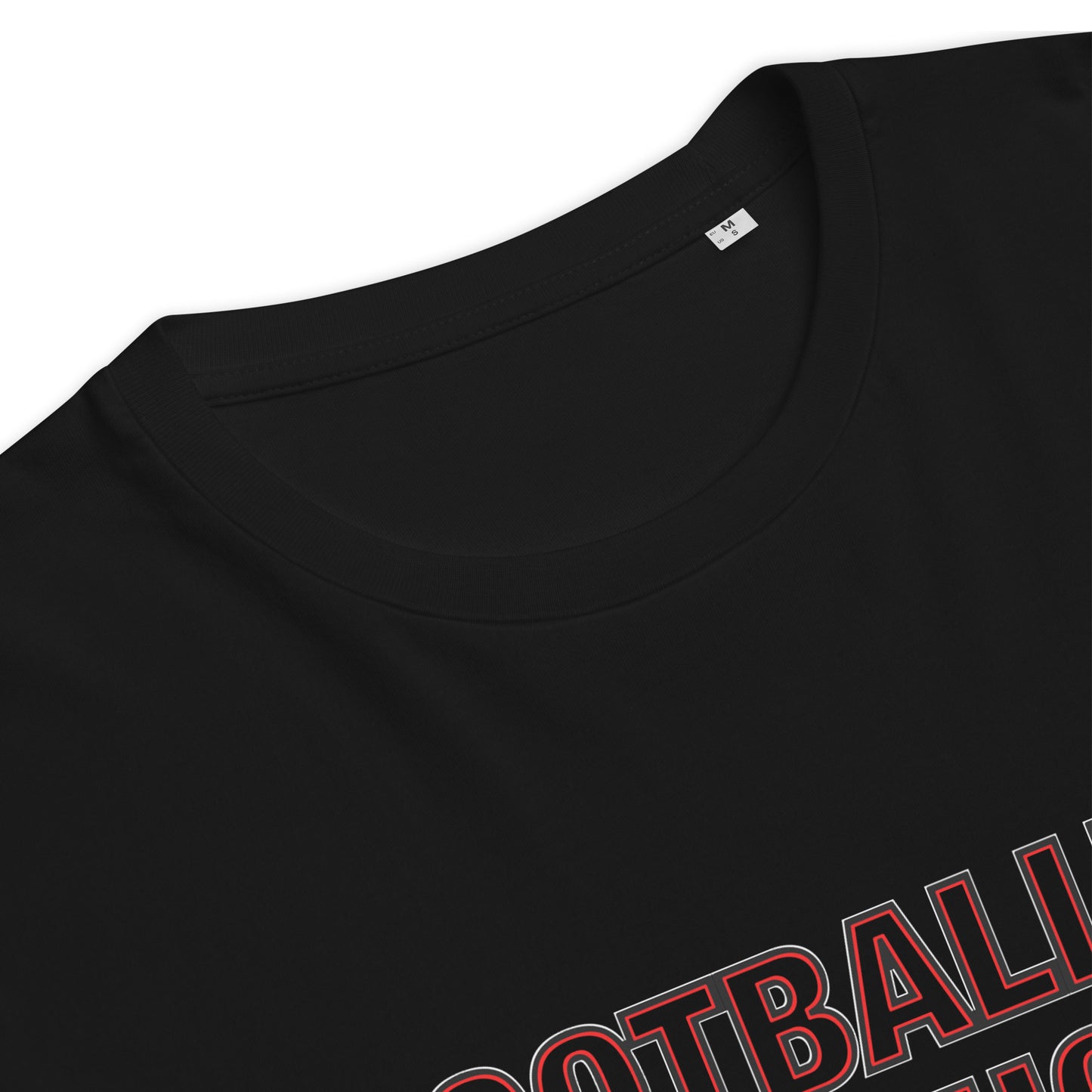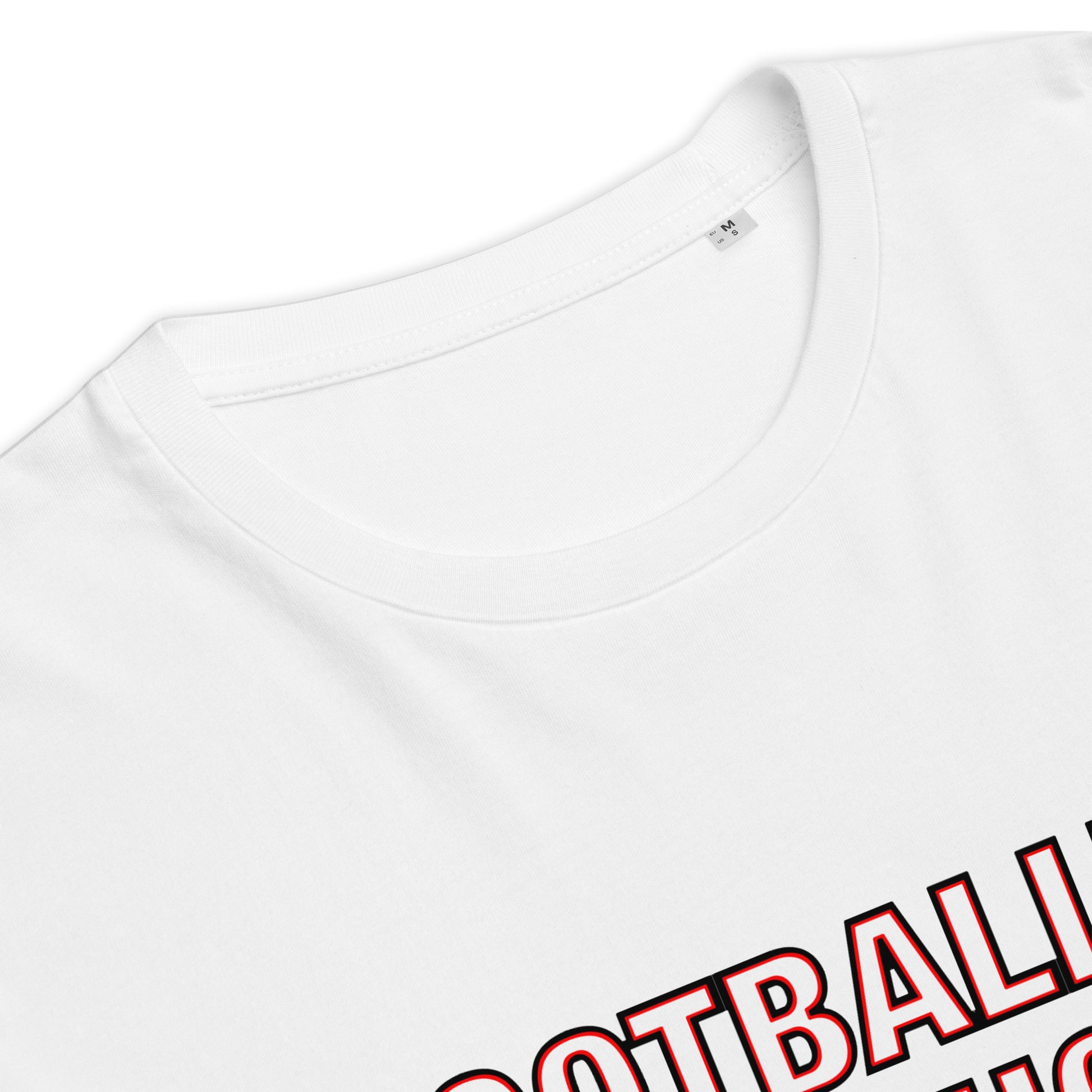 This unisex organic cotton England Euro 2024 Football Tournament themed t-shirt for men and women features a 'Football's Comin' Home' slogan with a cutout red and white neon lettering design which takes on the exact colour of the t-shirt, whichever that colour may be.