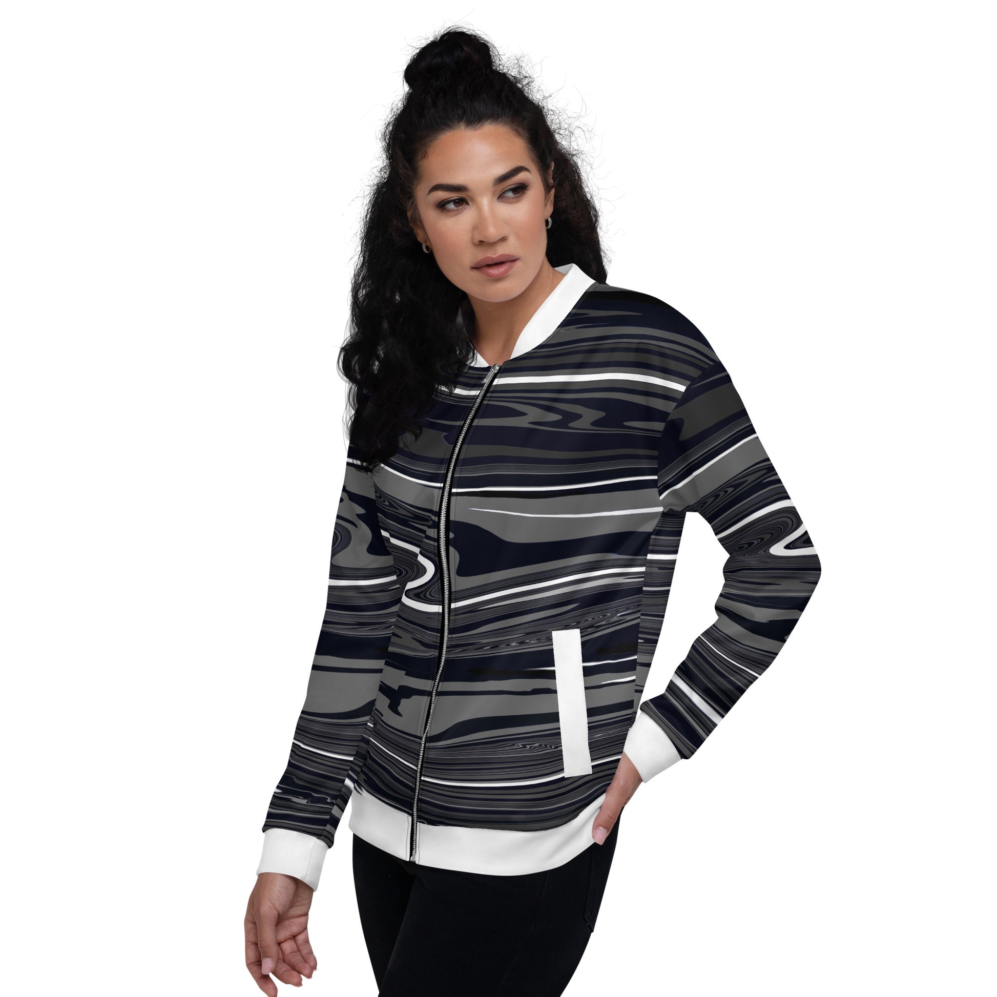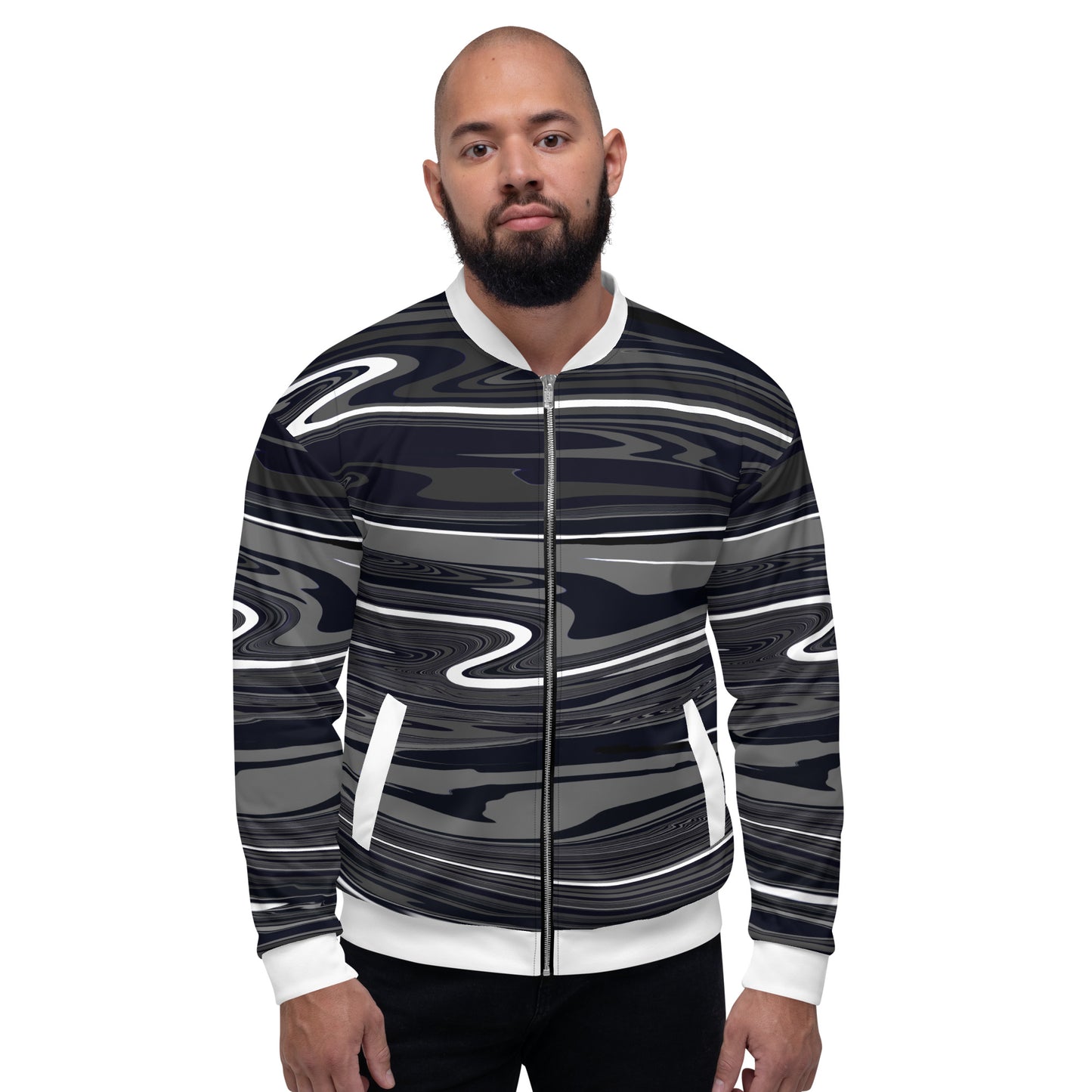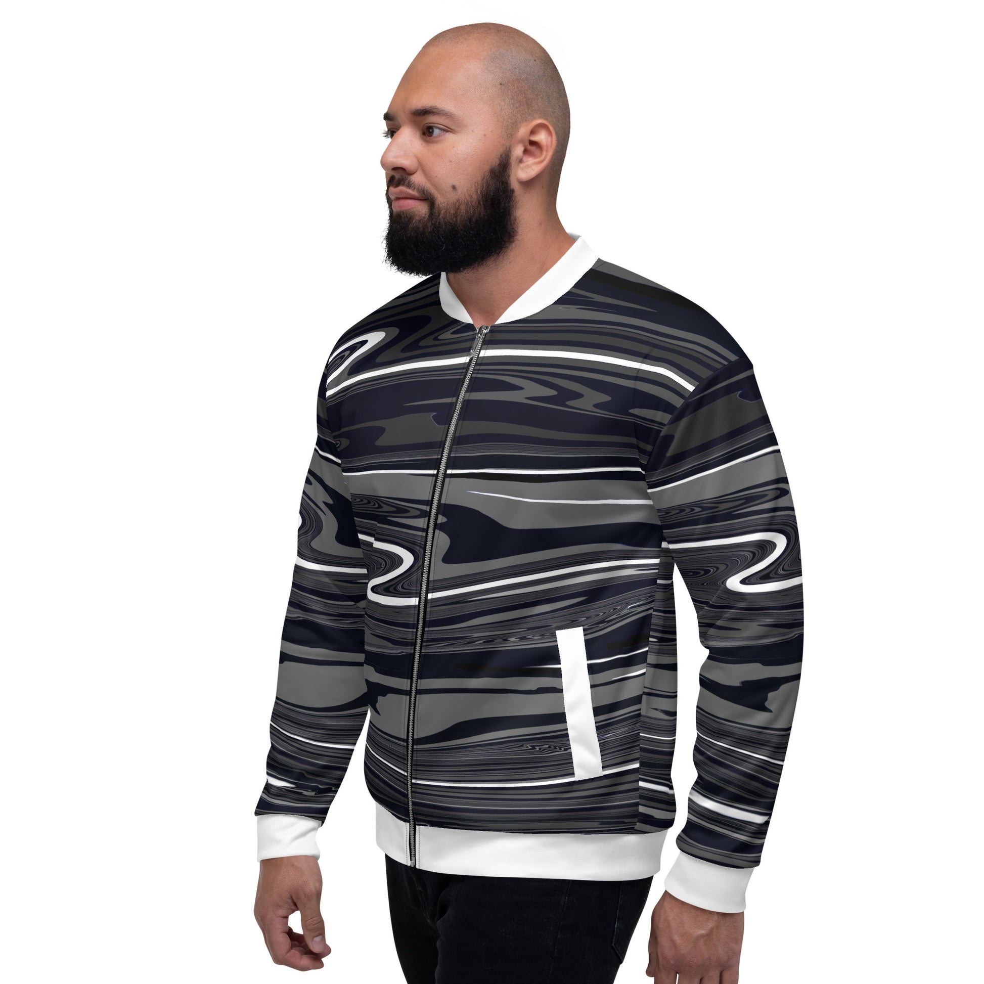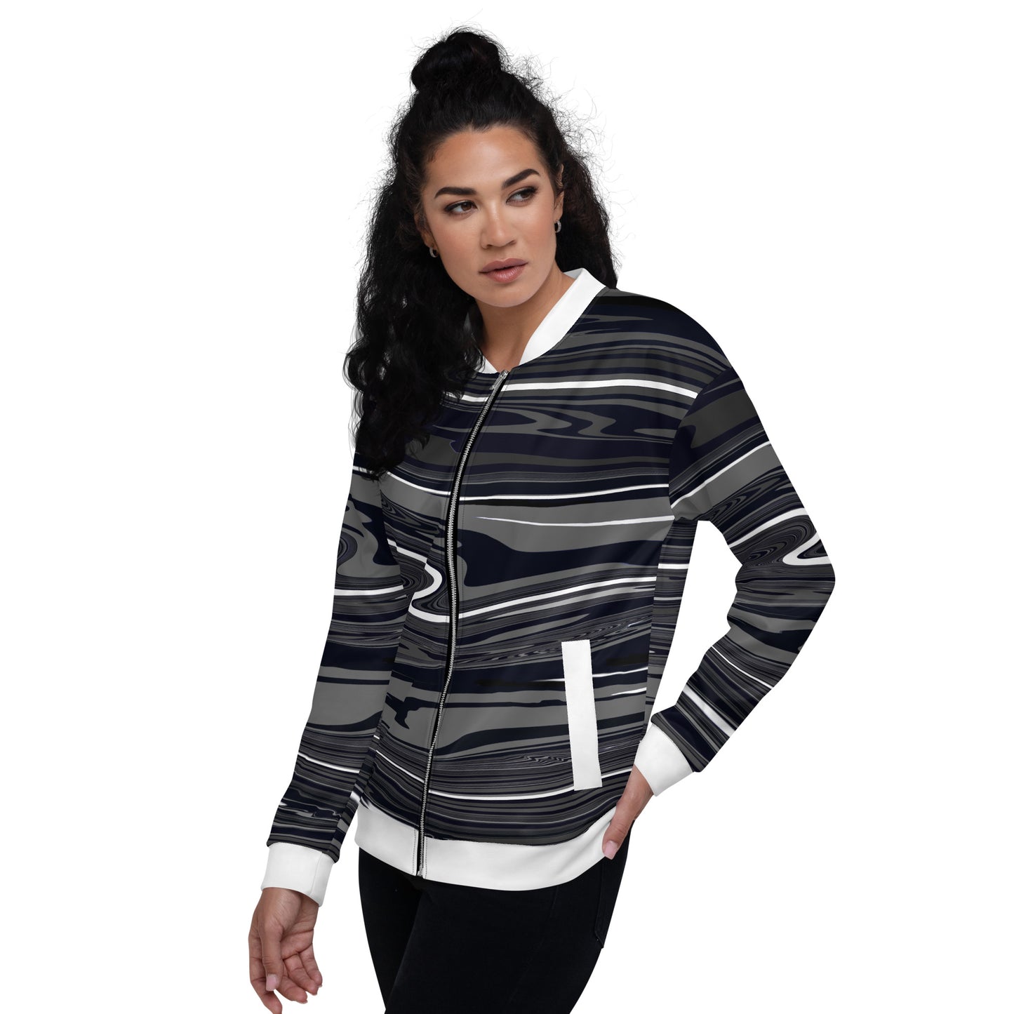 Make a statement and look absolutely fabulous in this dazzling abstract monochromatic striped all-over print unisex bomber jacket with contrasting details from Desirable Tees that is guaranteed to turn heads!