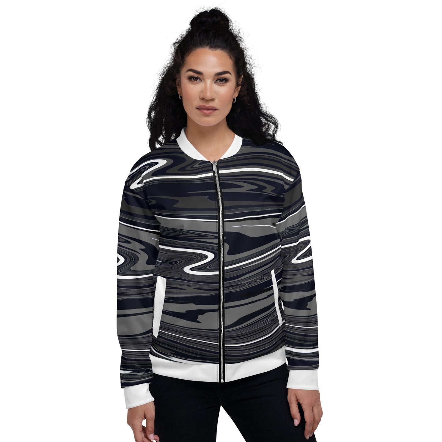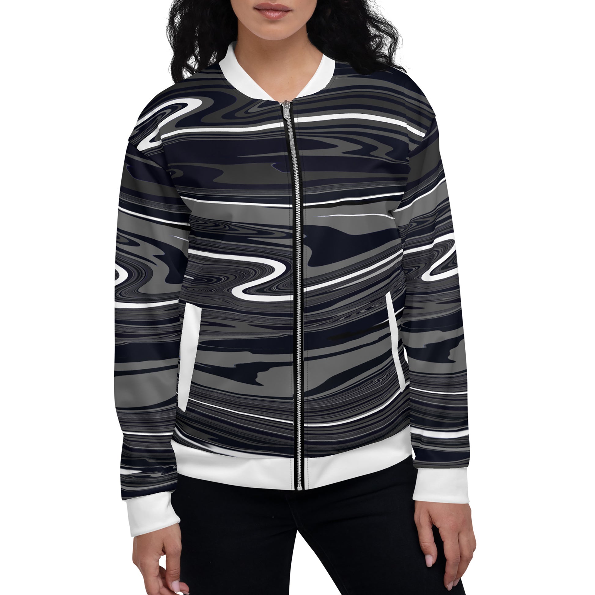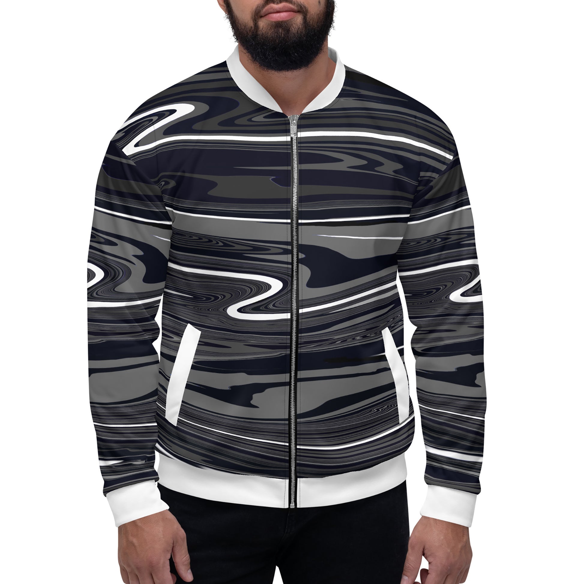 Make a statement and look absolutely fabulous in this dazzling abstract monochromatic striped all-over print unisex bomber jacket with contrasting details from Desirable Tees that is guaranteed to turn heads!
