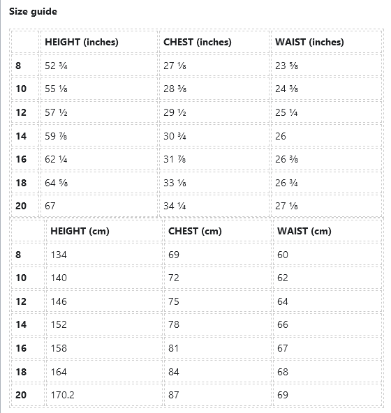 | HEIGHT (cm) | CHEST (cm) | WAIST (cm) | |