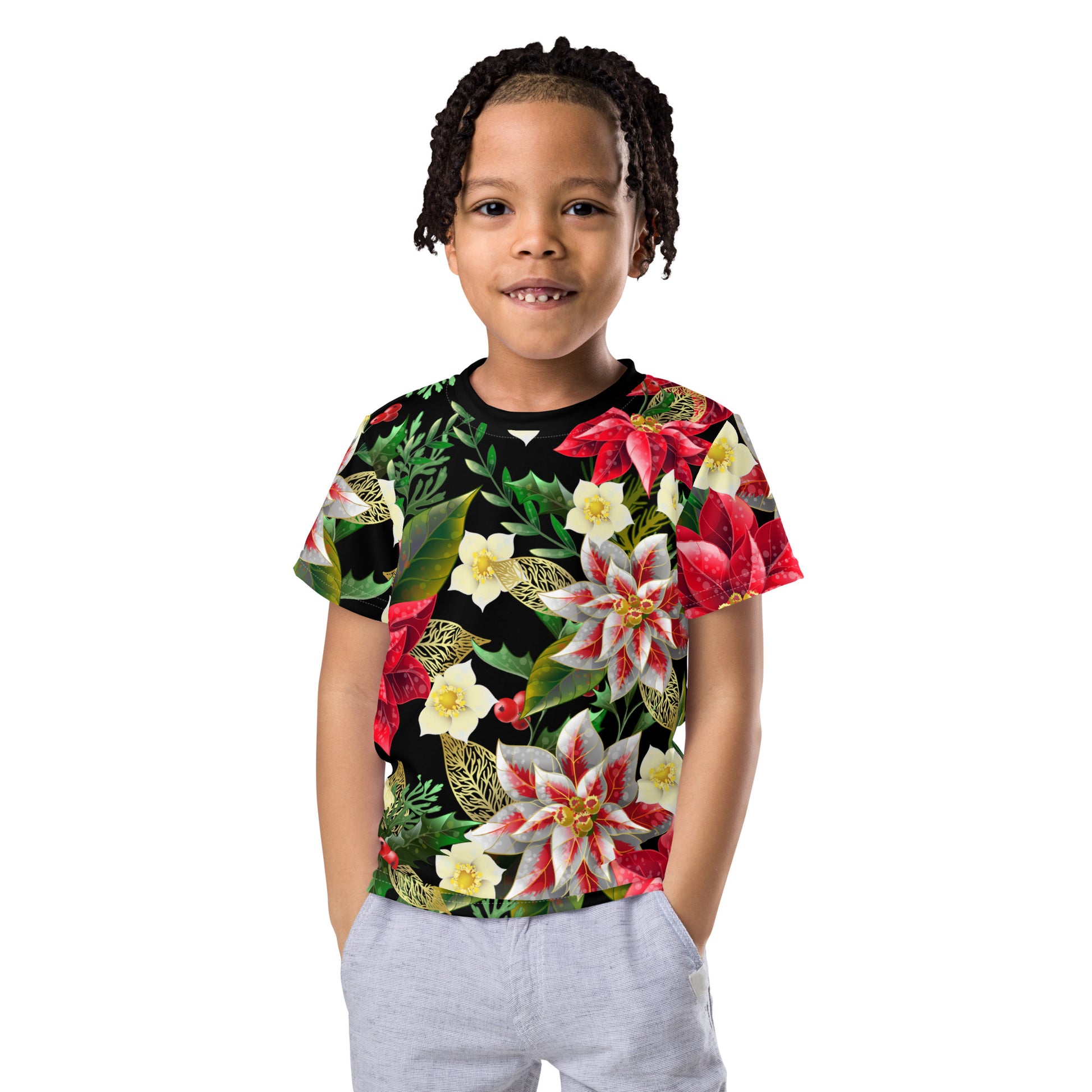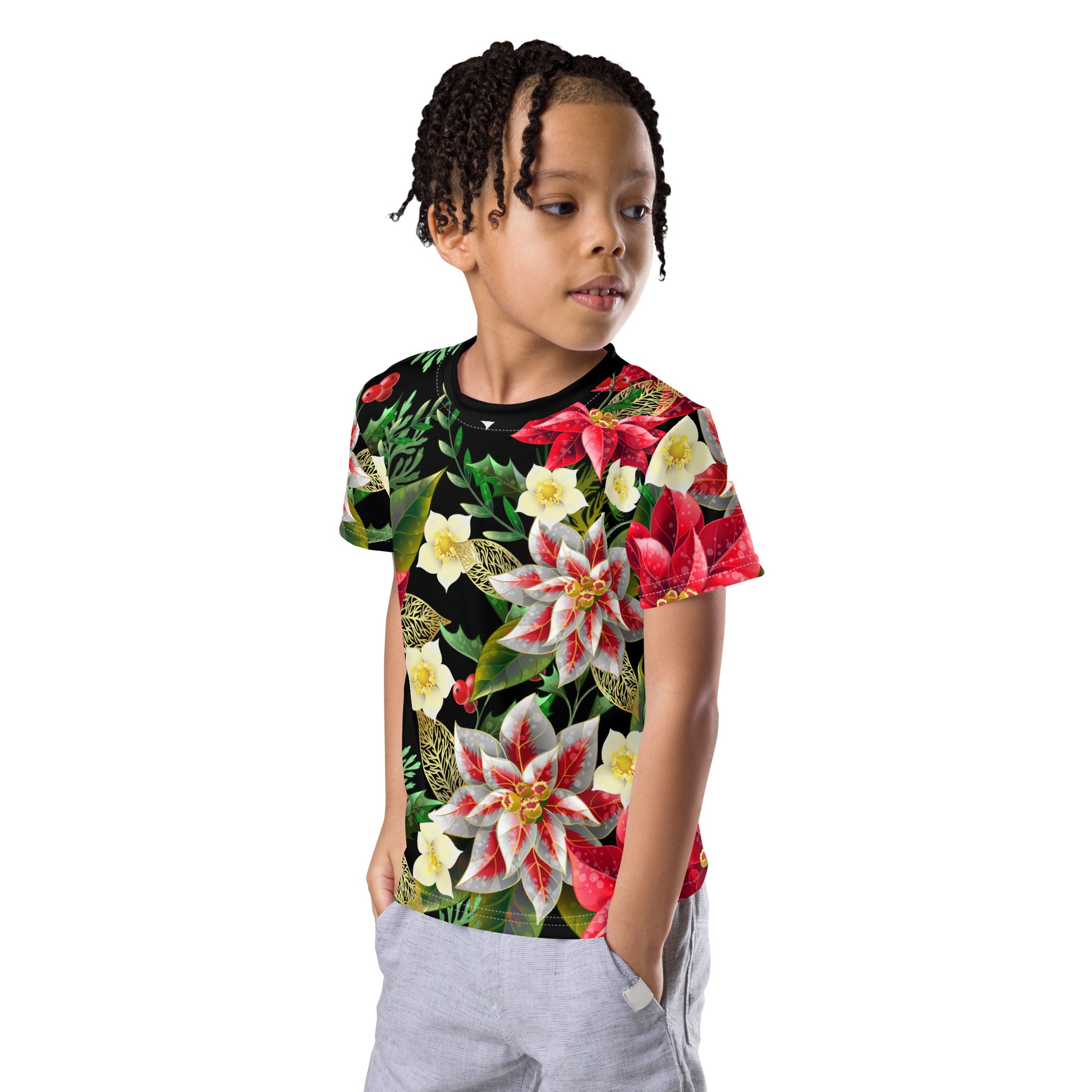 This multicoloured, festive and Christmas themed Poinsettia and holly all-over print kid's t-shirt from Desirable Tees is guaranteed to turn heads and make their friends envious!