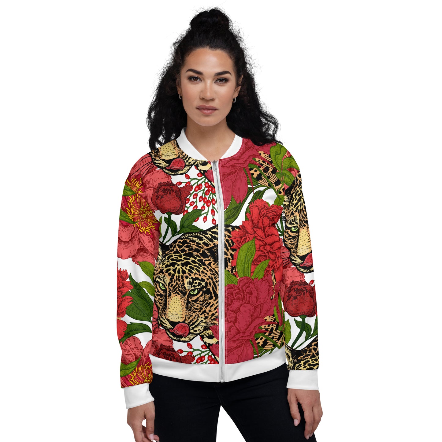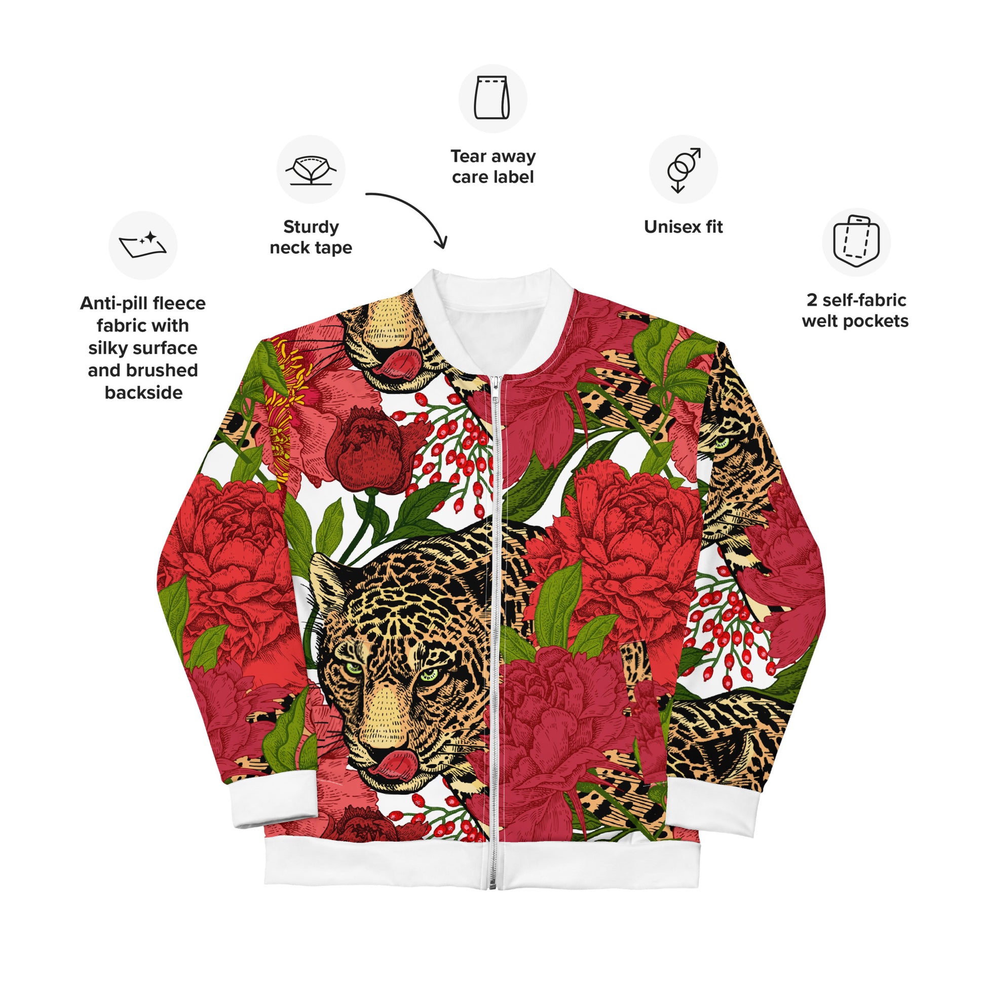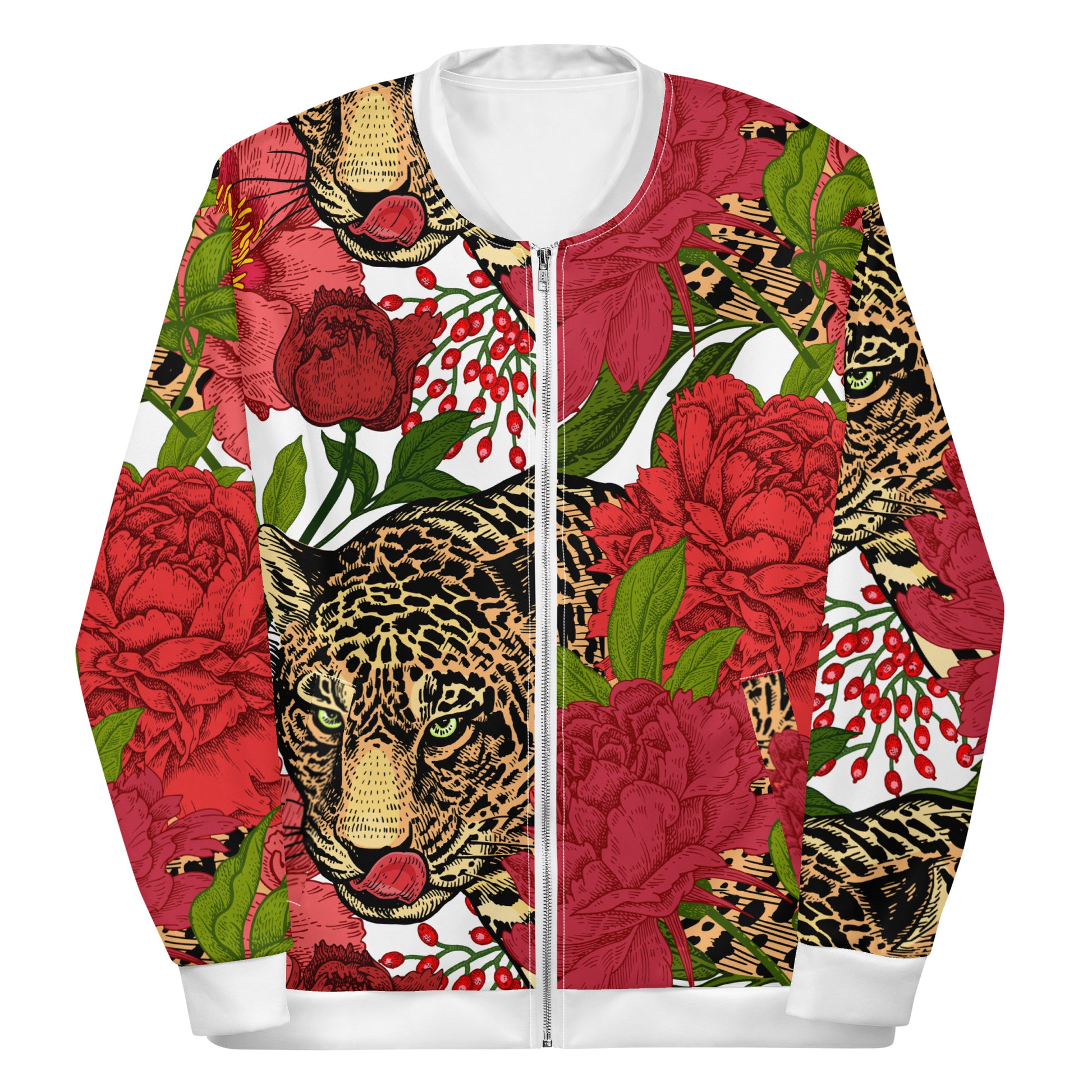 Make a statement and look absolutely fabulous with this multicoloured leopard and floral all-over print unisex bomber jacket from Desirable Tees that is guaranteed to turn heads!