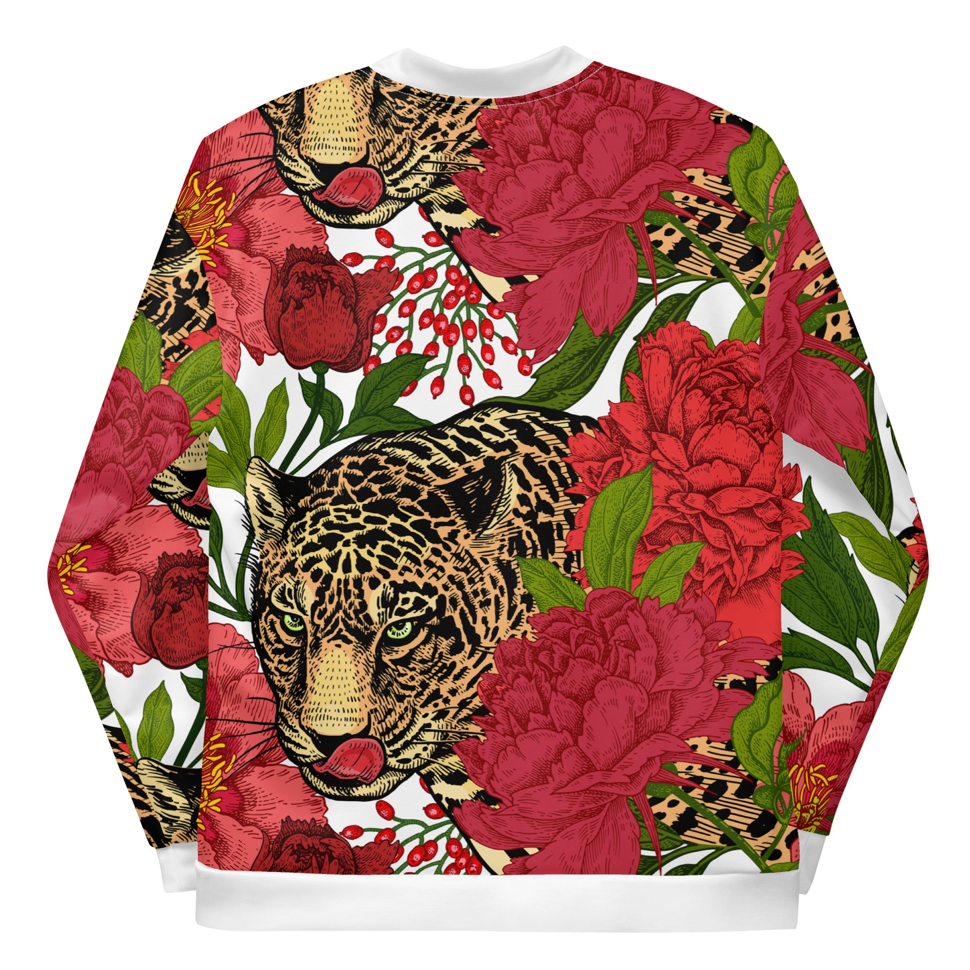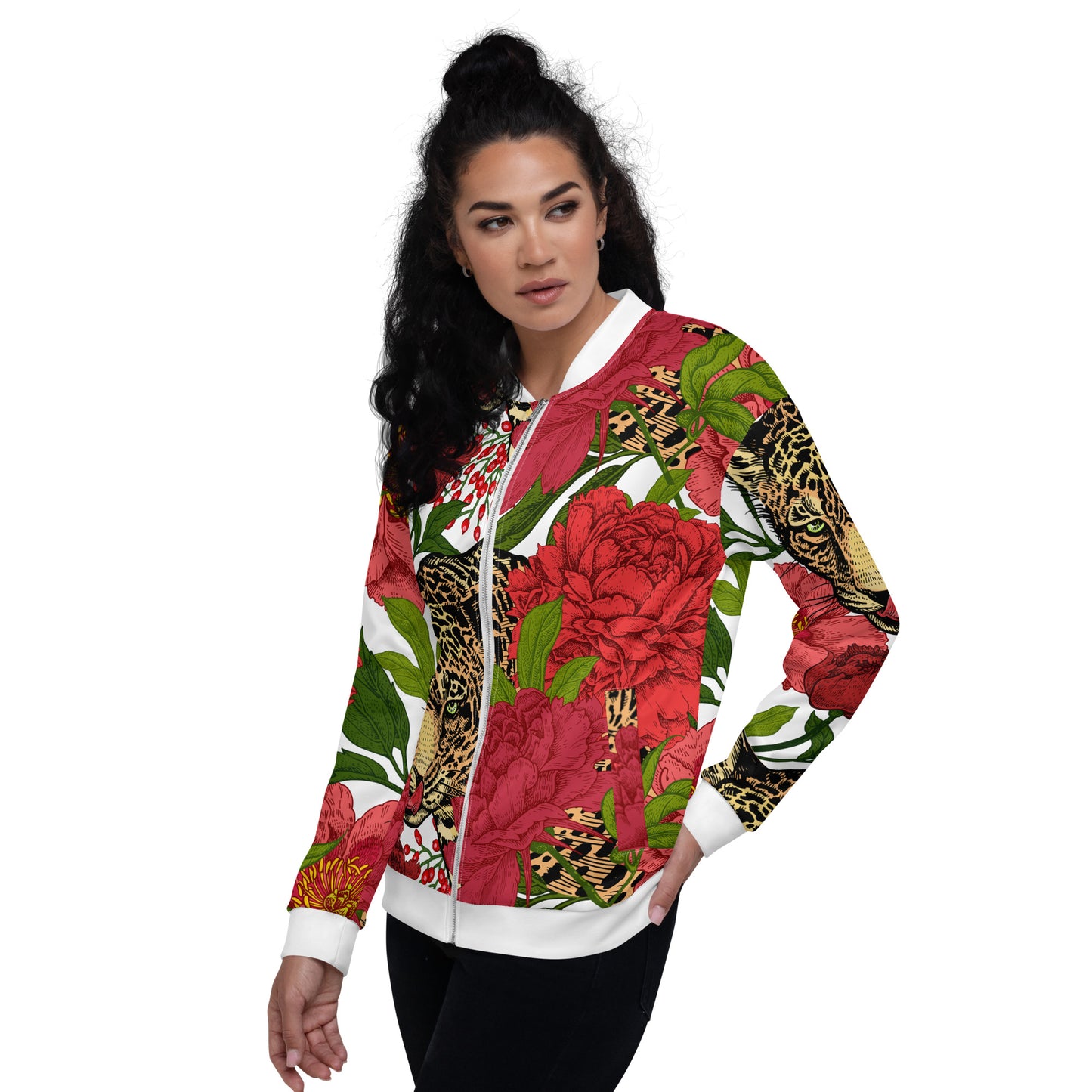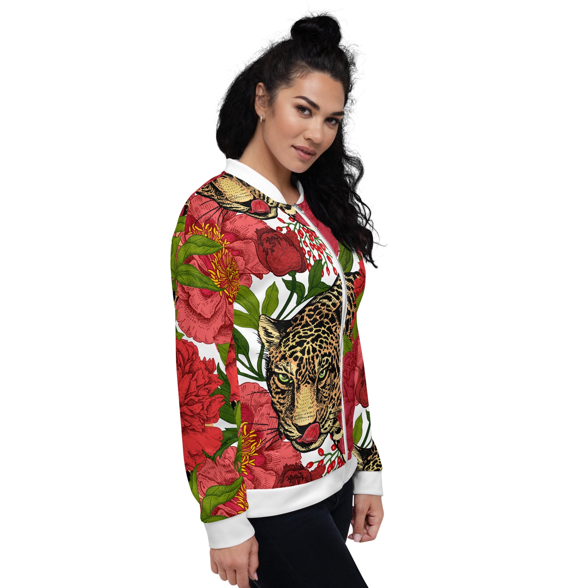 Make a statement and look absolutely fabulous with this multicoloured leopard and floral all-over print unisex bomber jacket from Desirable Tees that is guaranteed to turn heads!