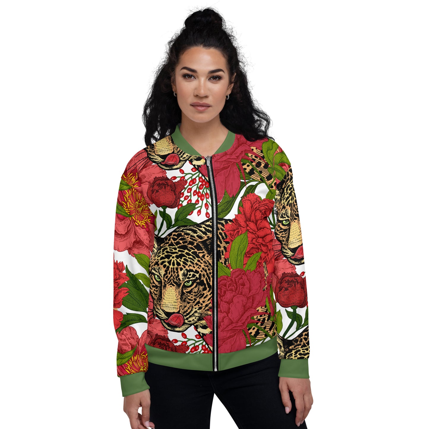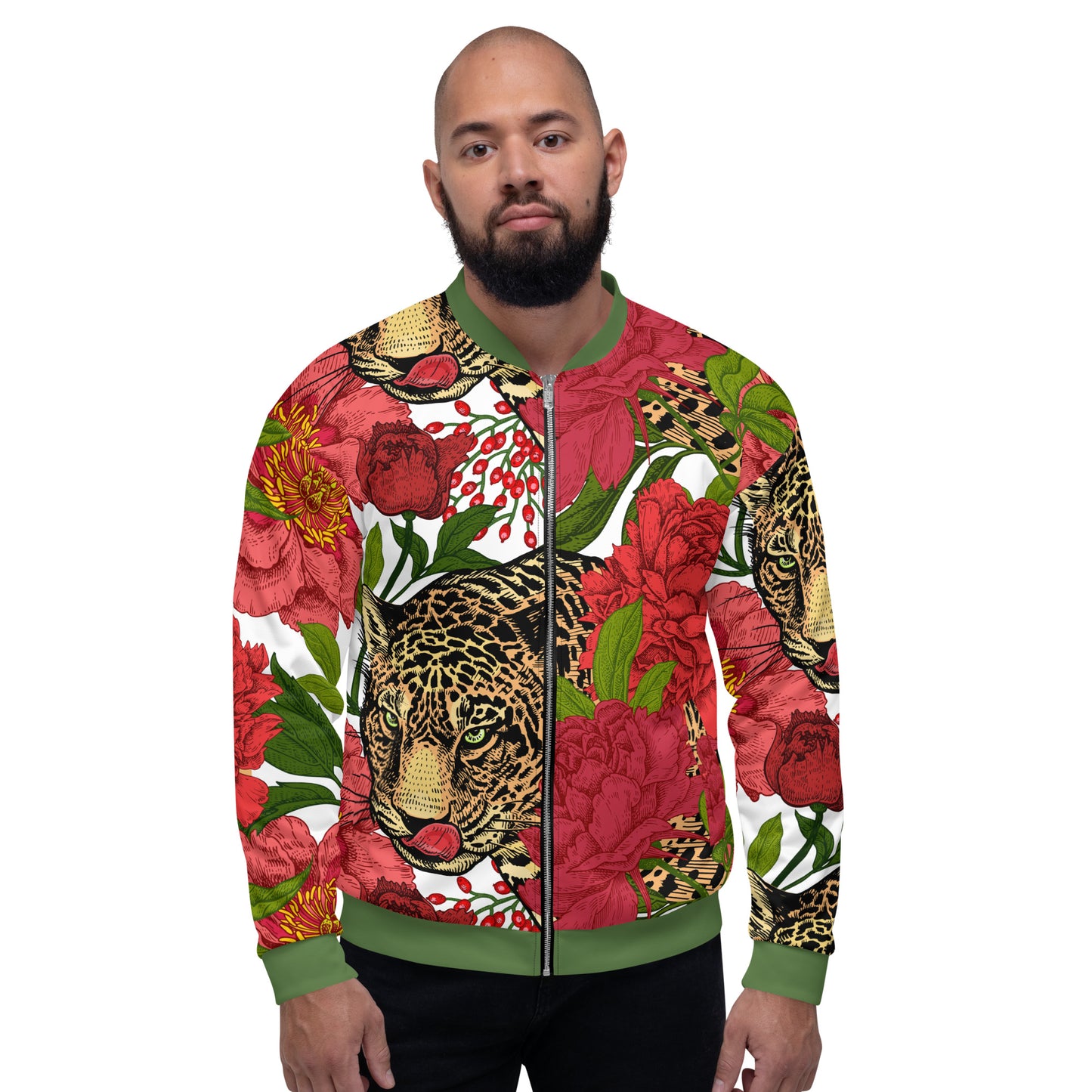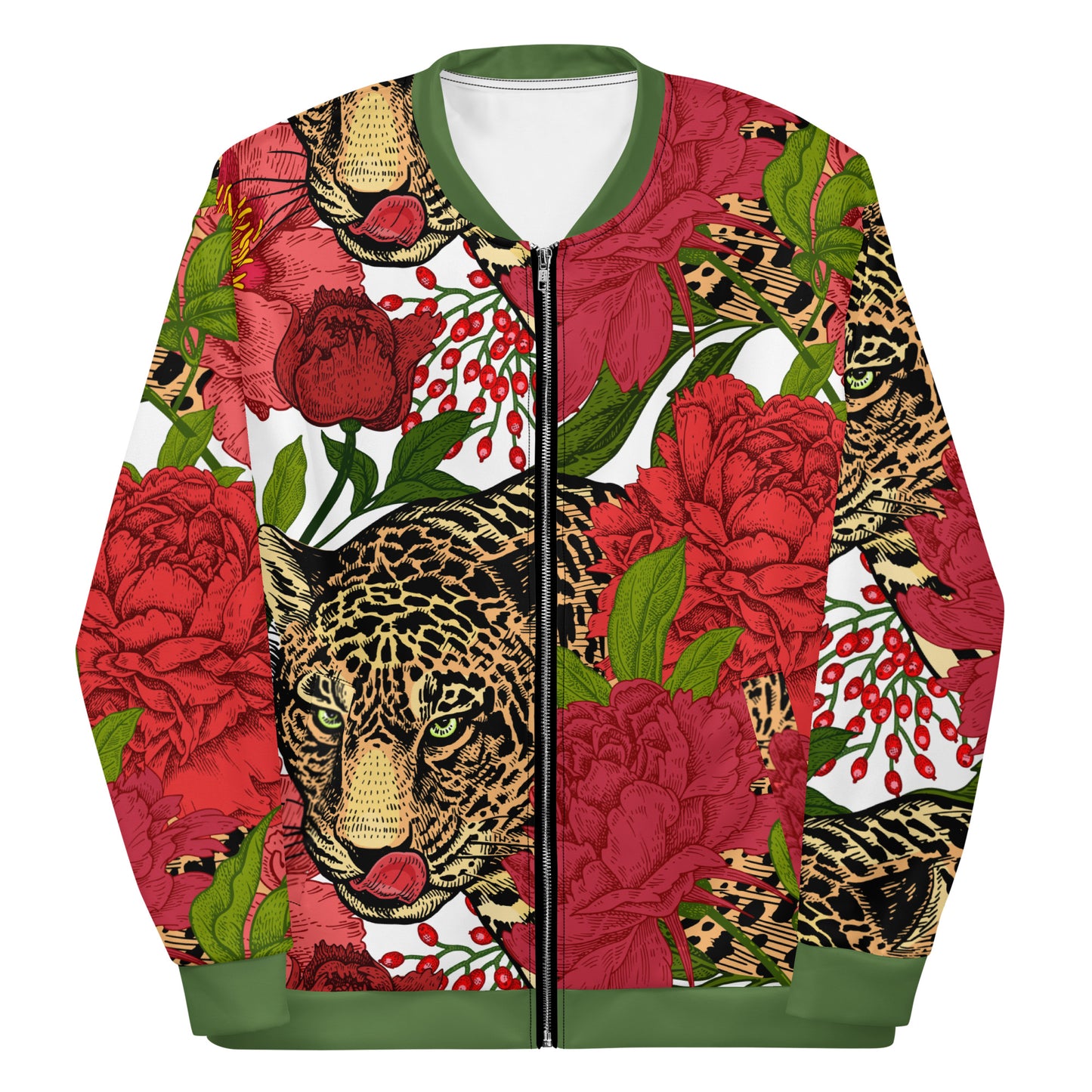 Make a statement and look absolutely fabulous with this multicoloured leopard and floral all-over print unisex bomber jacket from Desirable Tees that is guaranteed to turn heads!
