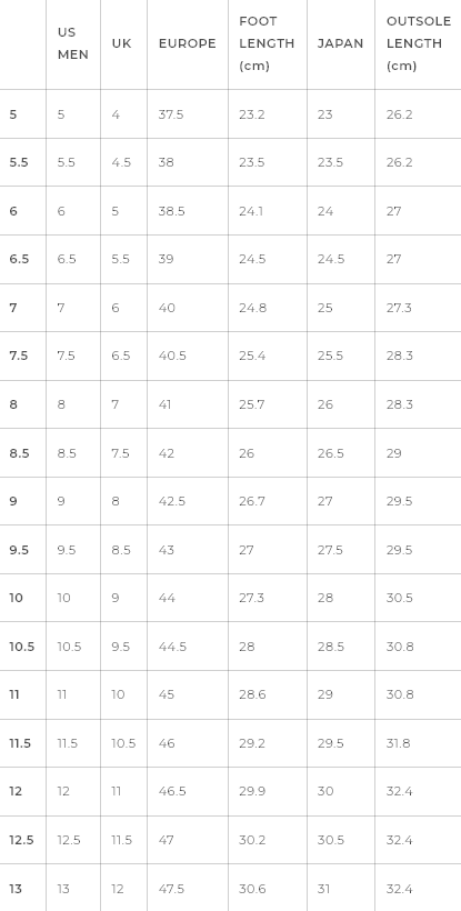 | US MEN | UK | EUROPE | FOOT LENGTH (cm) | JAPAN | OUTSOLE LENGTH (cm) | |