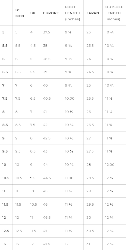 | US MEN | UK | EUROPE | FOOT LENGTH (inches) | JAPAN | OUTSOLE LENGTH (inches) | |