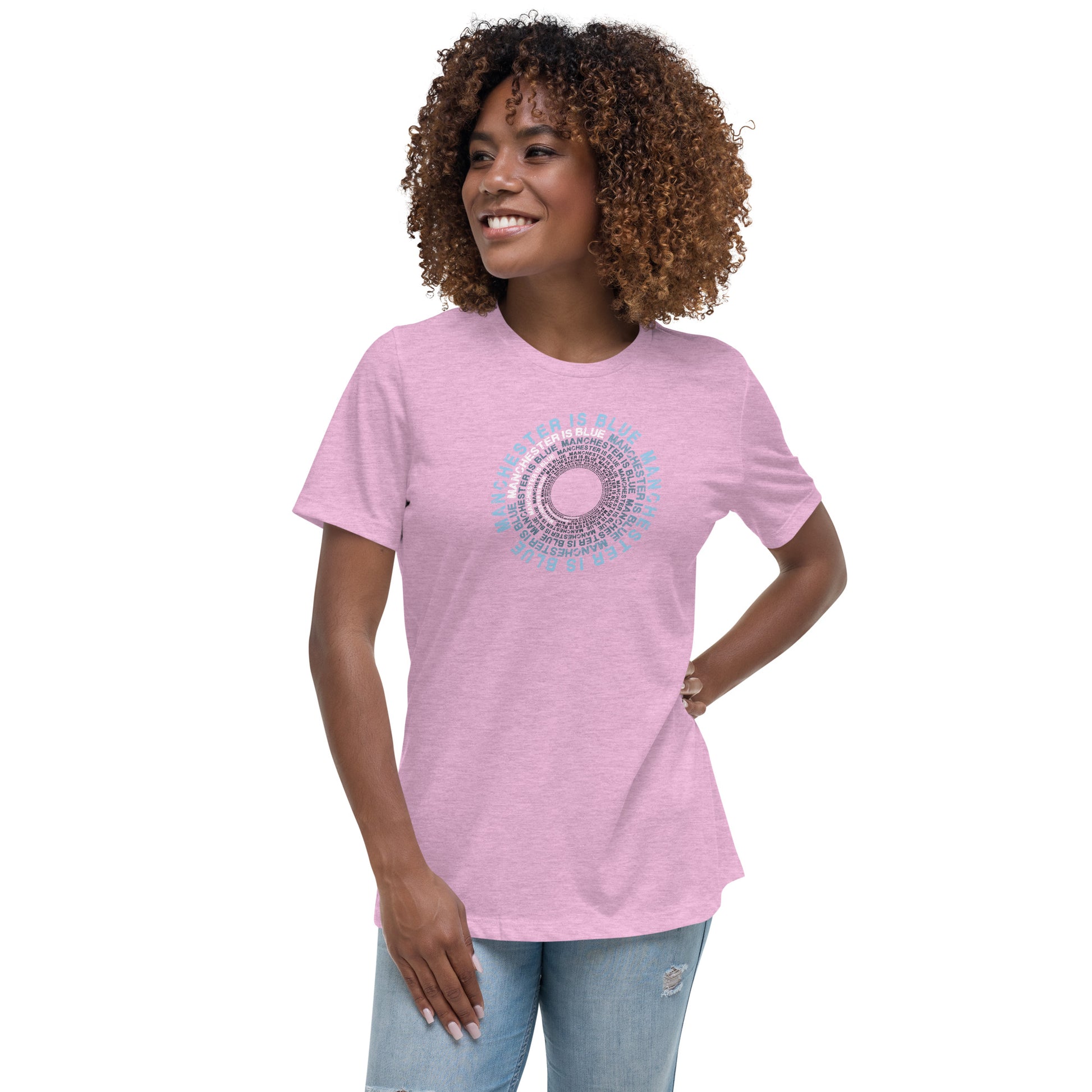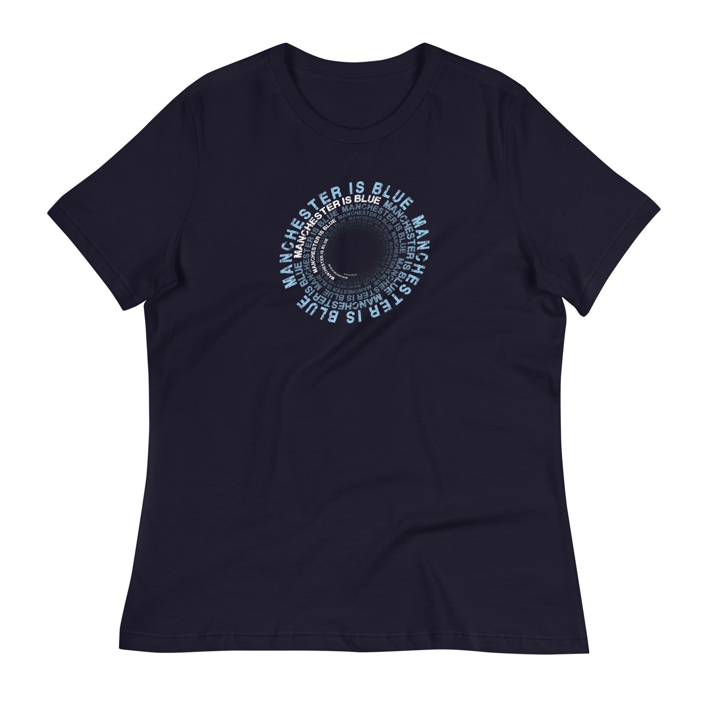 This women's soft cotton t-shirt features a humorous 'Manchester Is Blue' slogan in a distressed font and a truly unique spiralling and circle gradient design. It starts off with City blue and then slowly fades to black-blue at the centre. For all City football supporters who support the blue half of Manchester!