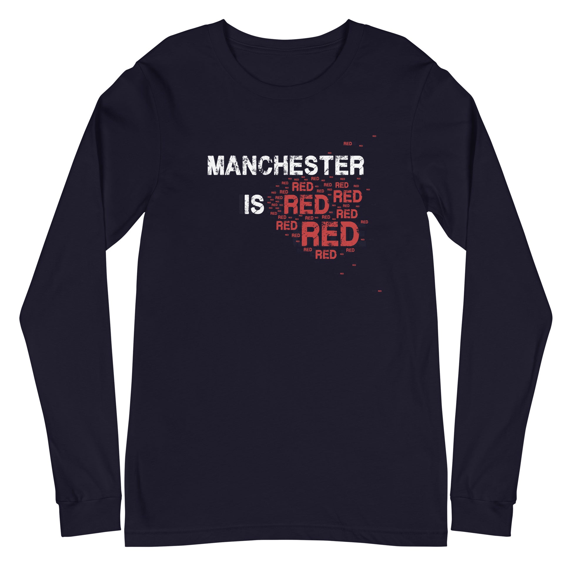 This unisex long sleeve t-shirt features a humorous 'Manchester Is Red' slogan in a repeated and distressed font. For all United football supporters who support the red half of Manchester!