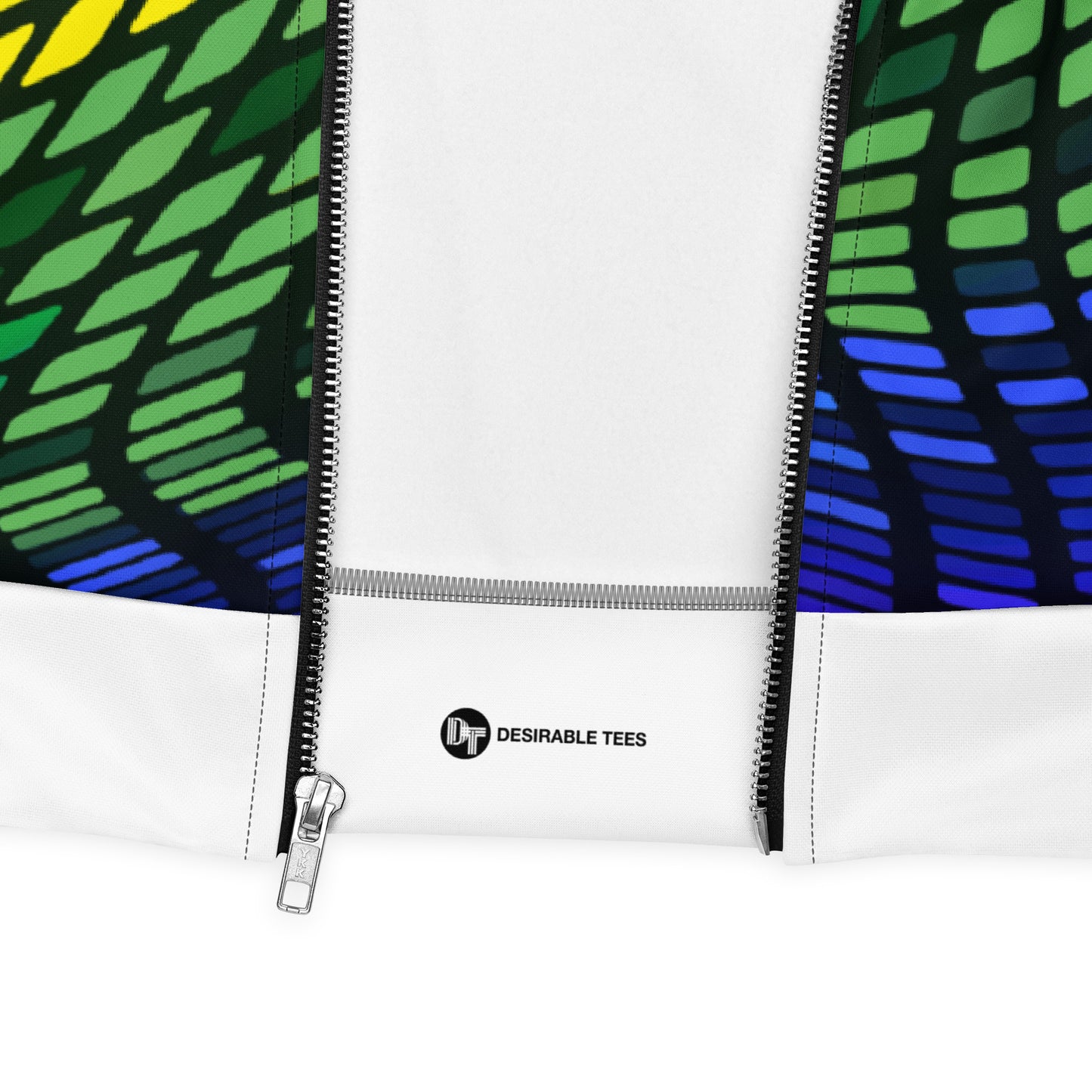 Featuring tiled and warped rainbow colours in a unique all-over print, a contrast varsity collar, a central zip fastening, two contrasting side welt pockets, contrasting ribbed cuffs and flat ribbed hem and it comes with a soft brushed fleece lining.