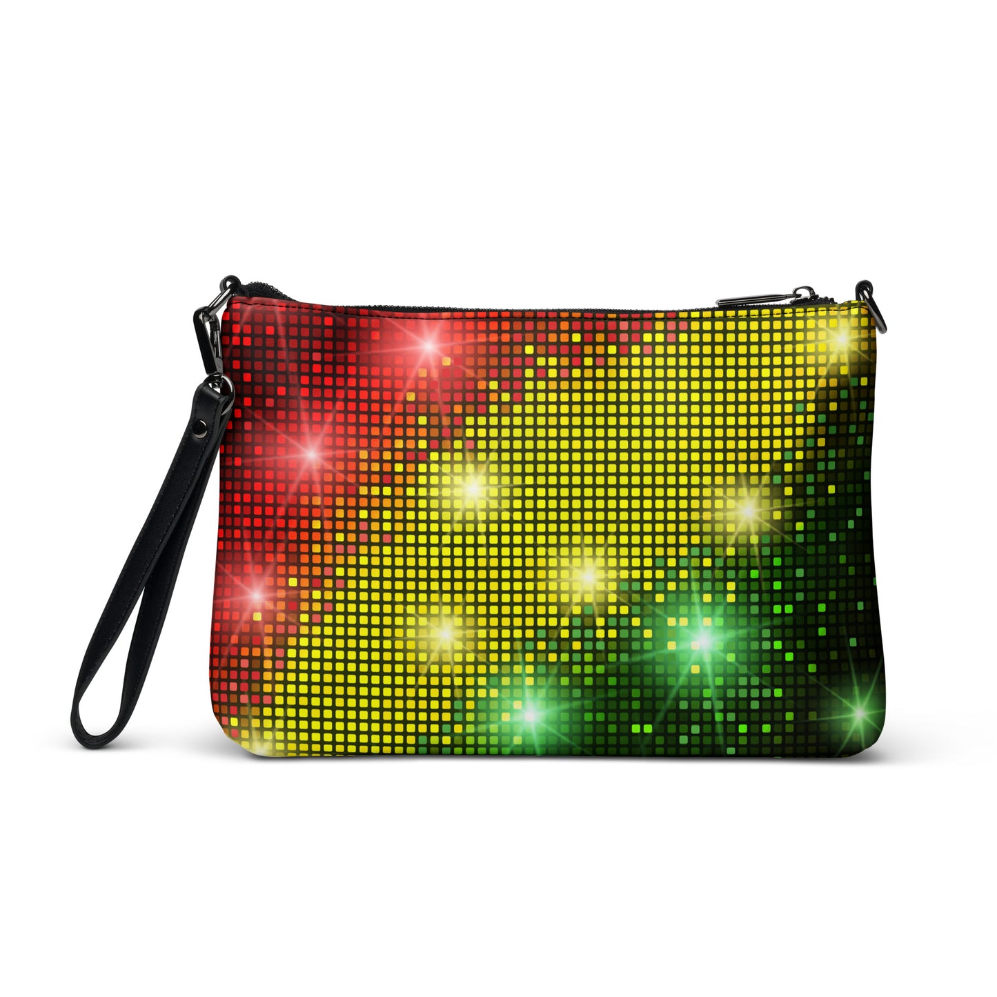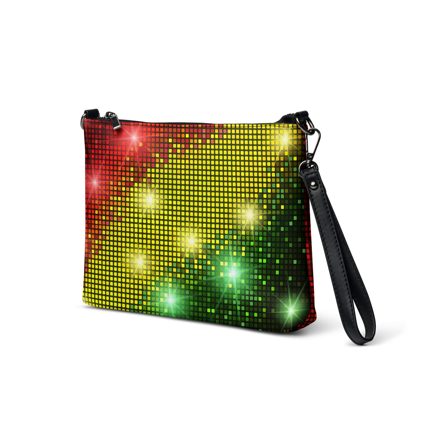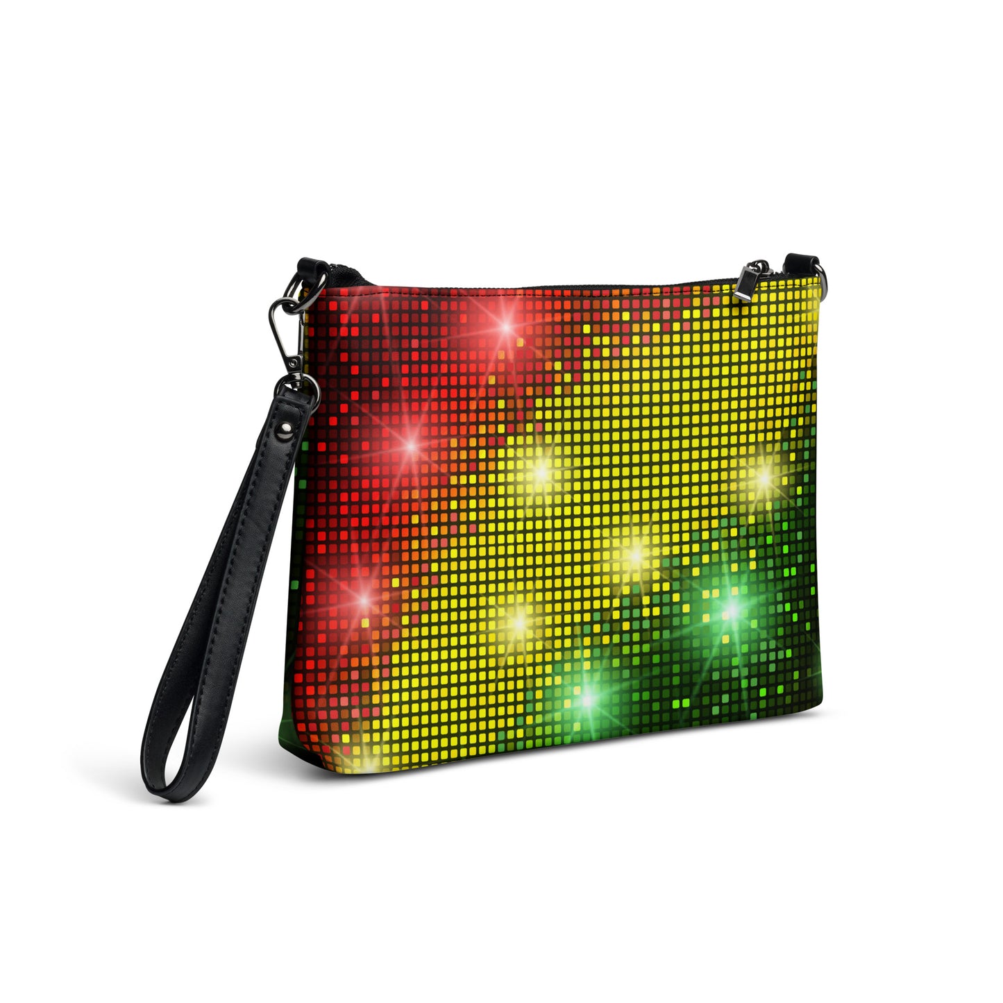 This women's crossbody bag from Desirable Tees is made from premium faux leather and features dark gray hardware, a top zip fastening closure and multiple interior pockets. Transform the crossbody bag with removable wrist and shoulder straps to style it for day-to-night looks. Featuring a red, gold and green sparkling disco and party lights all-over print that is guaranteed to turn heads.