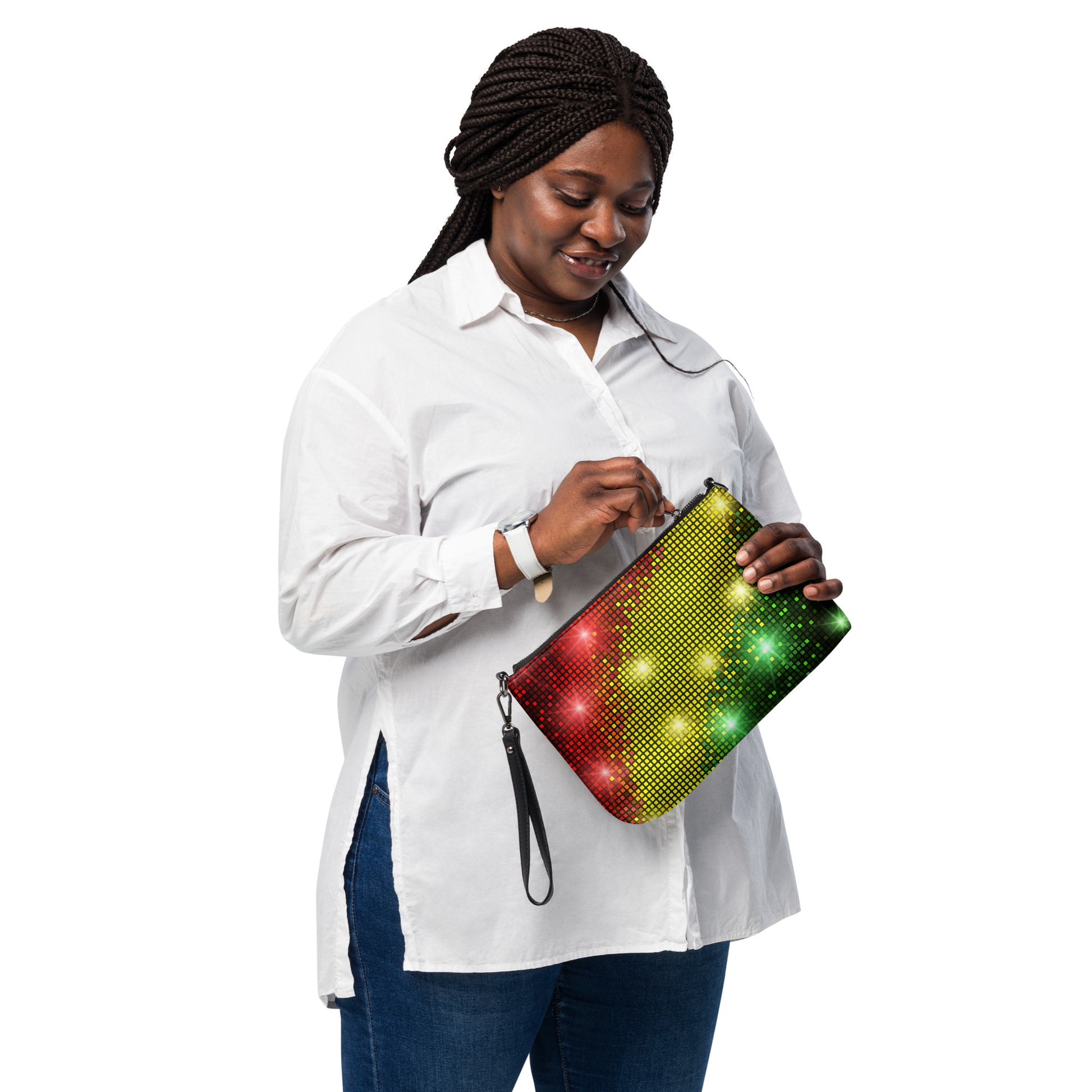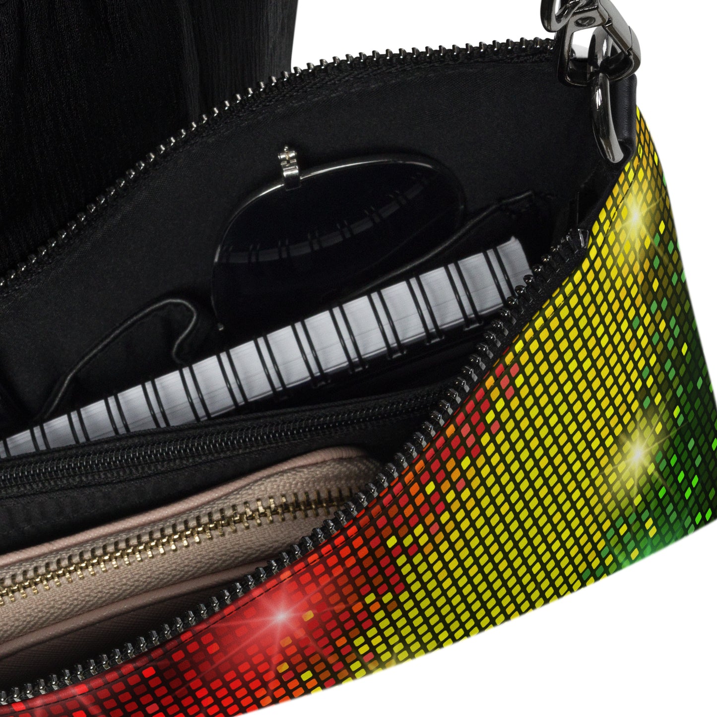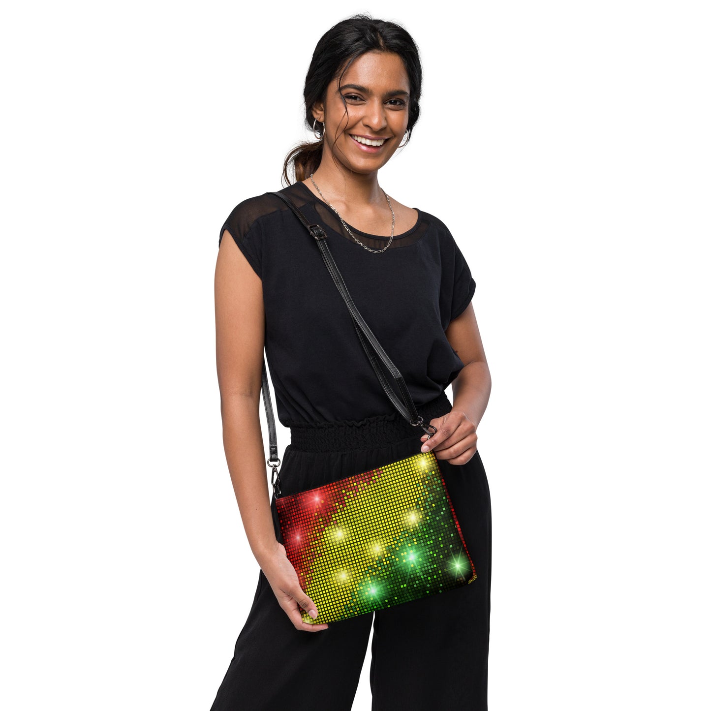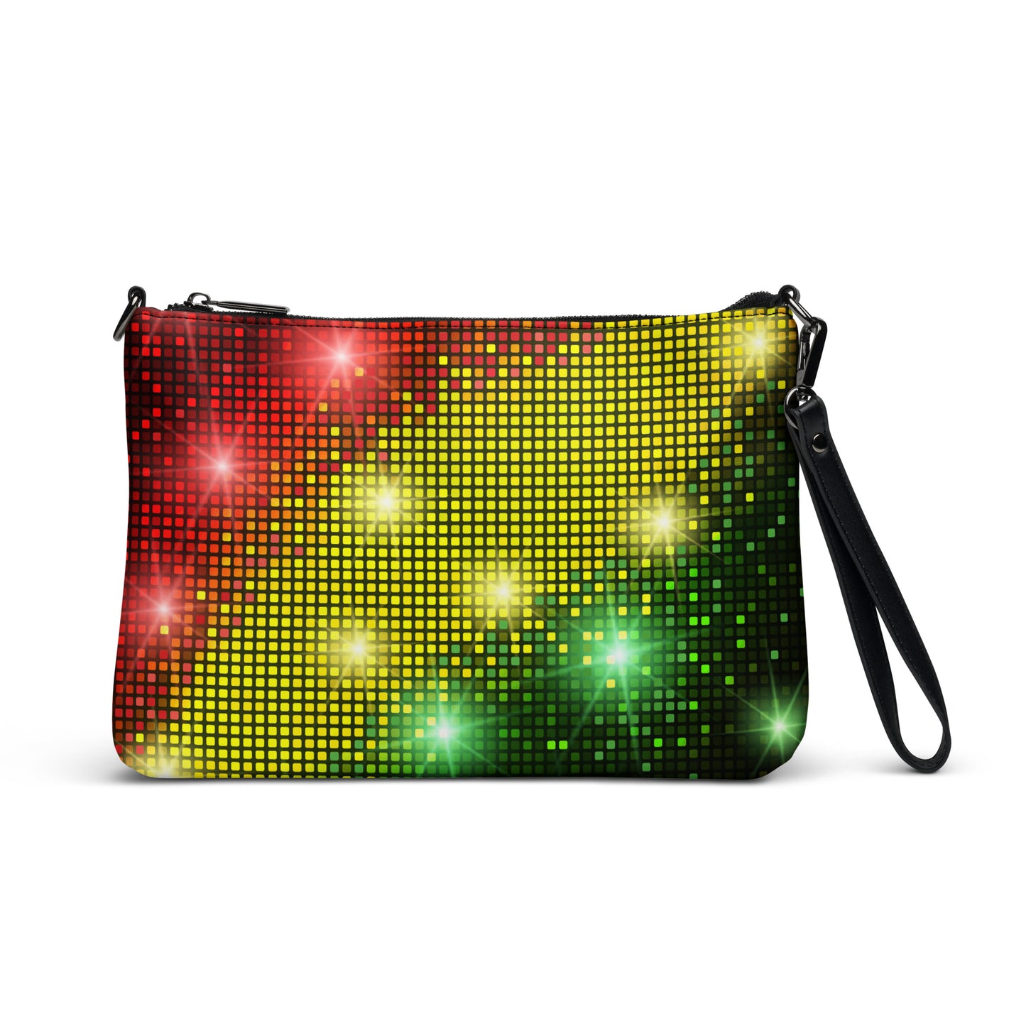 This women's crossbody bag from Desirable Tees is made from premium faux leather and features dark gray hardware, a top zip fastening closure and multiple interior pockets. Transform the crossbody bag with removable wrist and shoulder straps to style it for day-to-night looks. Featuring a red, gold and green sparkling disco and party lights all-over print that is guaranteed to turn heads.
