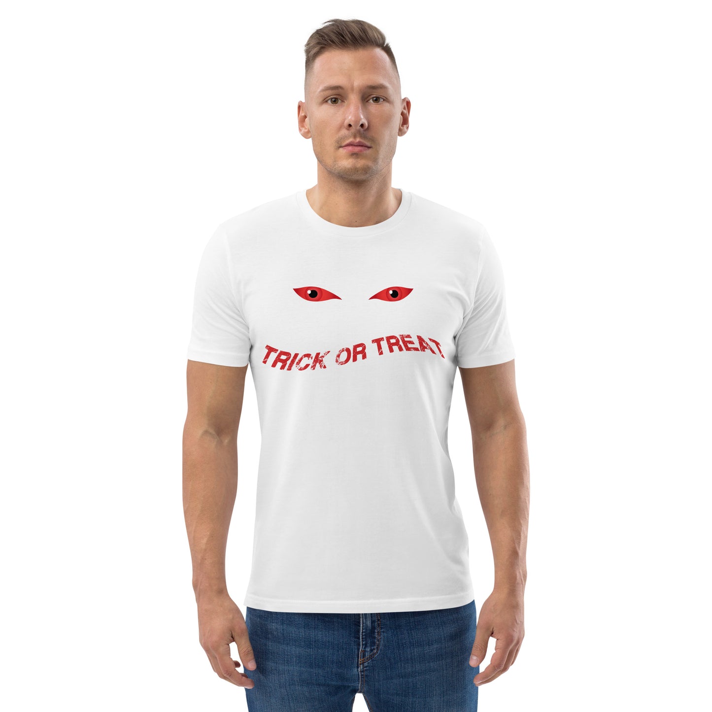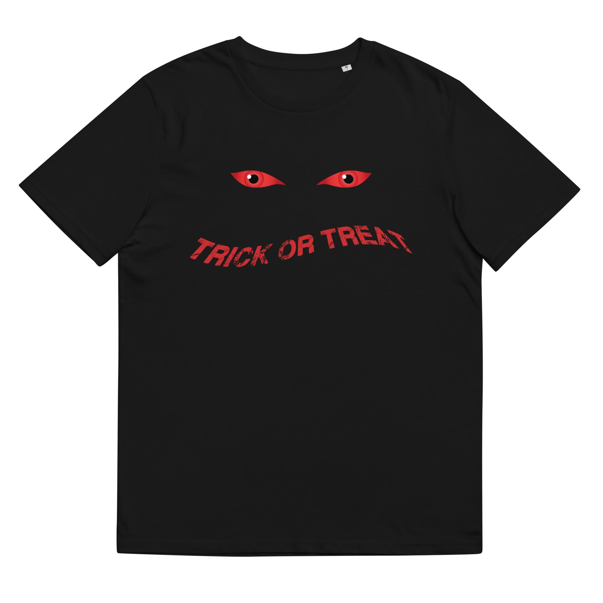 Trick Or Treat Halloween TShirt Spooky Demonic Blood Red Devil Eyes Unisex Organic Cotton T Shirt