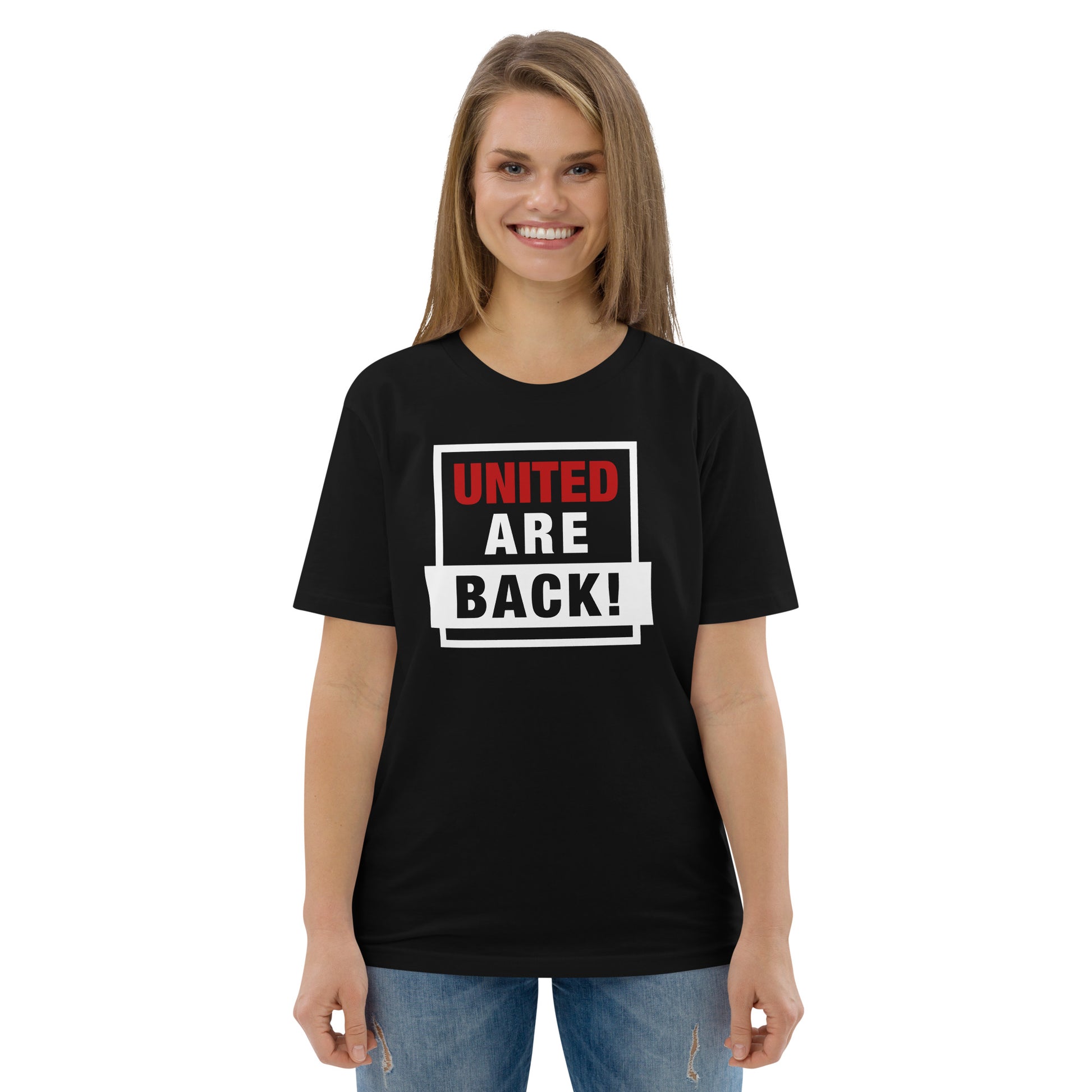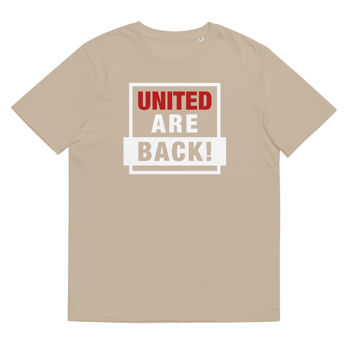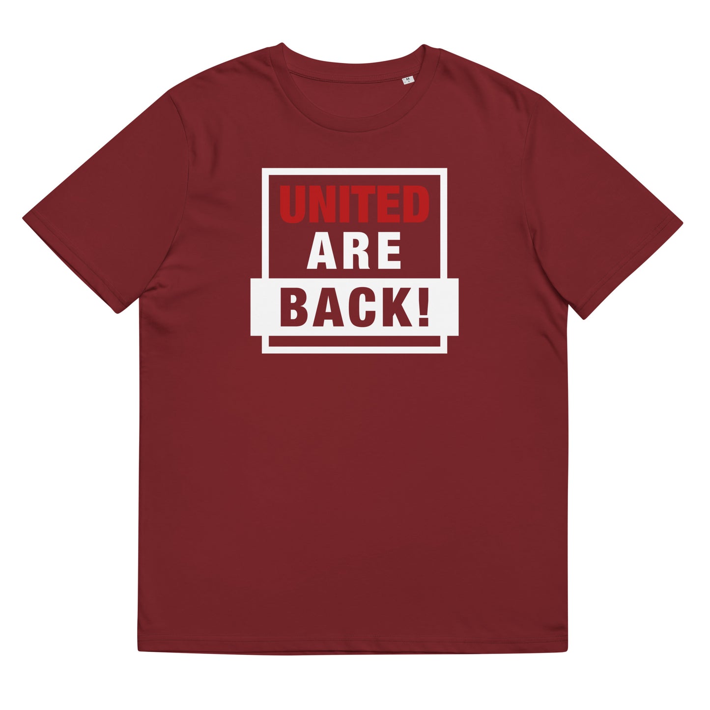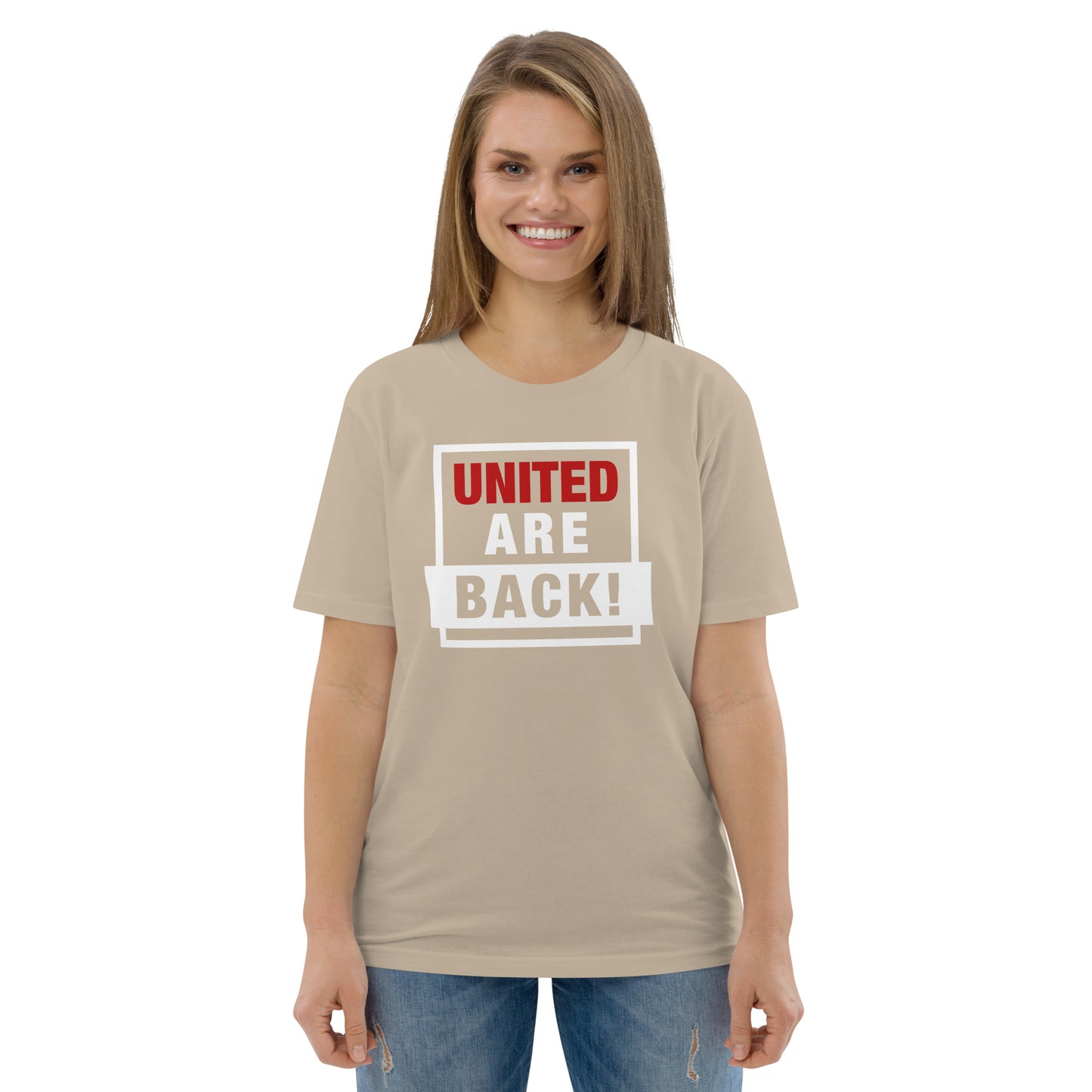 This unisex organic cotton t-shirt features a humorous 'United Are Back!' slogan in a square colour block and cutout design, with 'BACK!' taking on the exact colour of the t-shirt, whichever that colour may be.