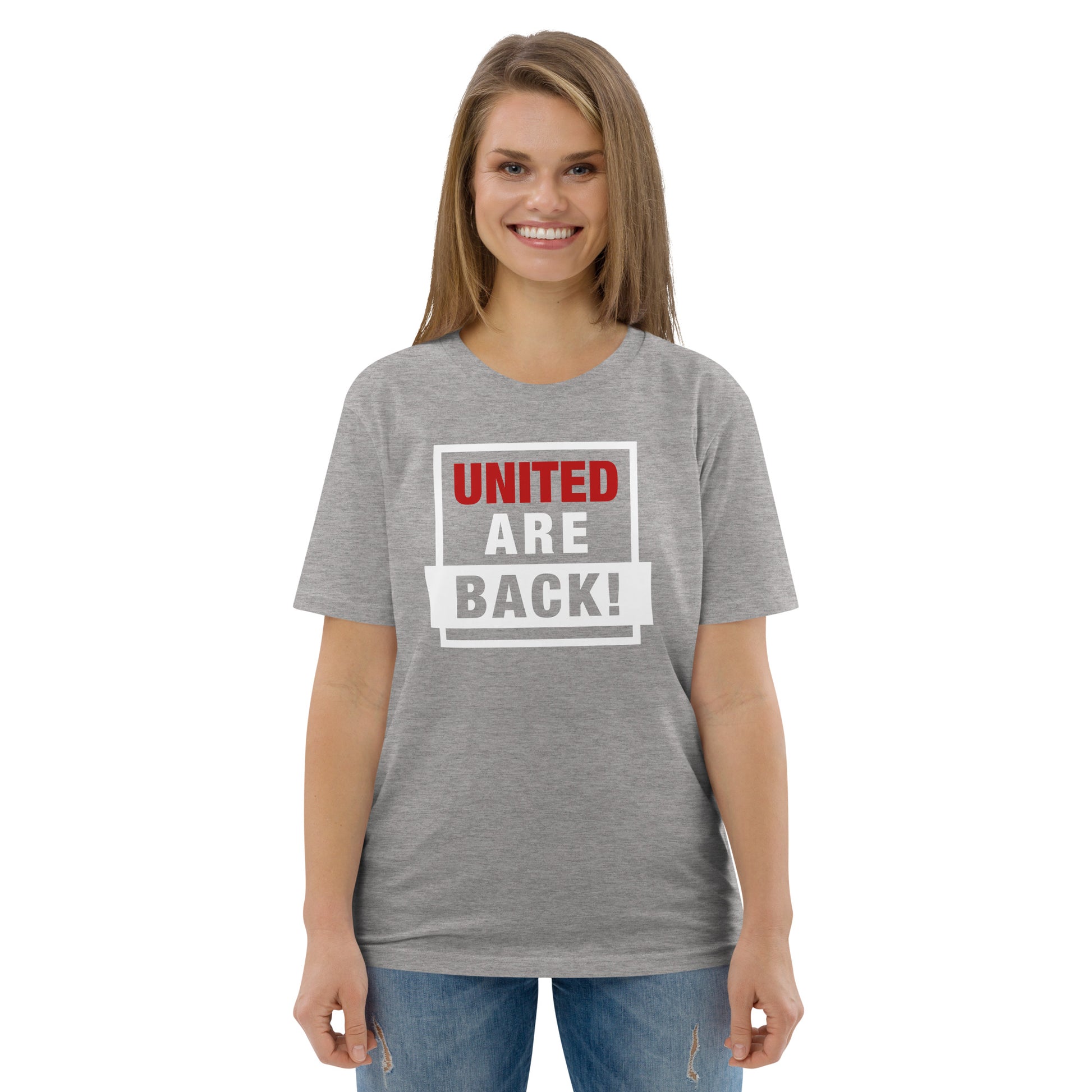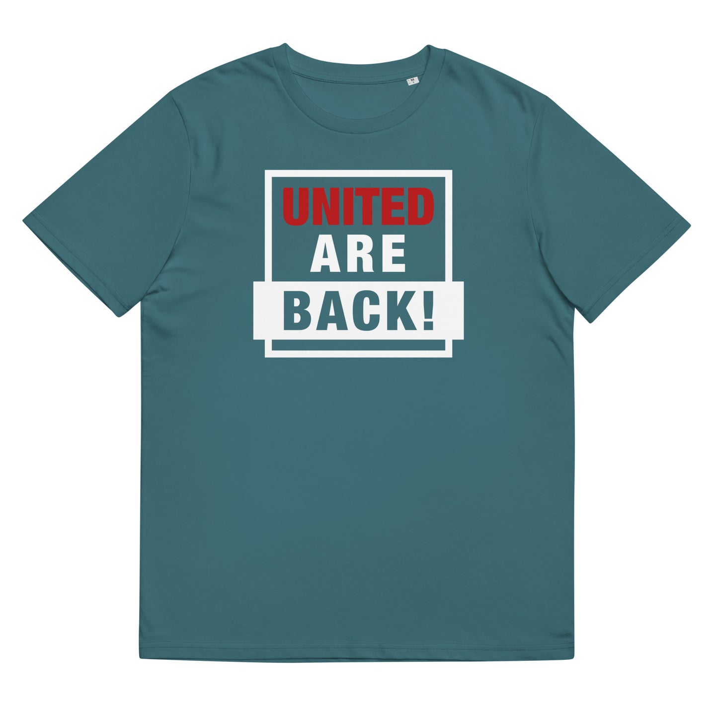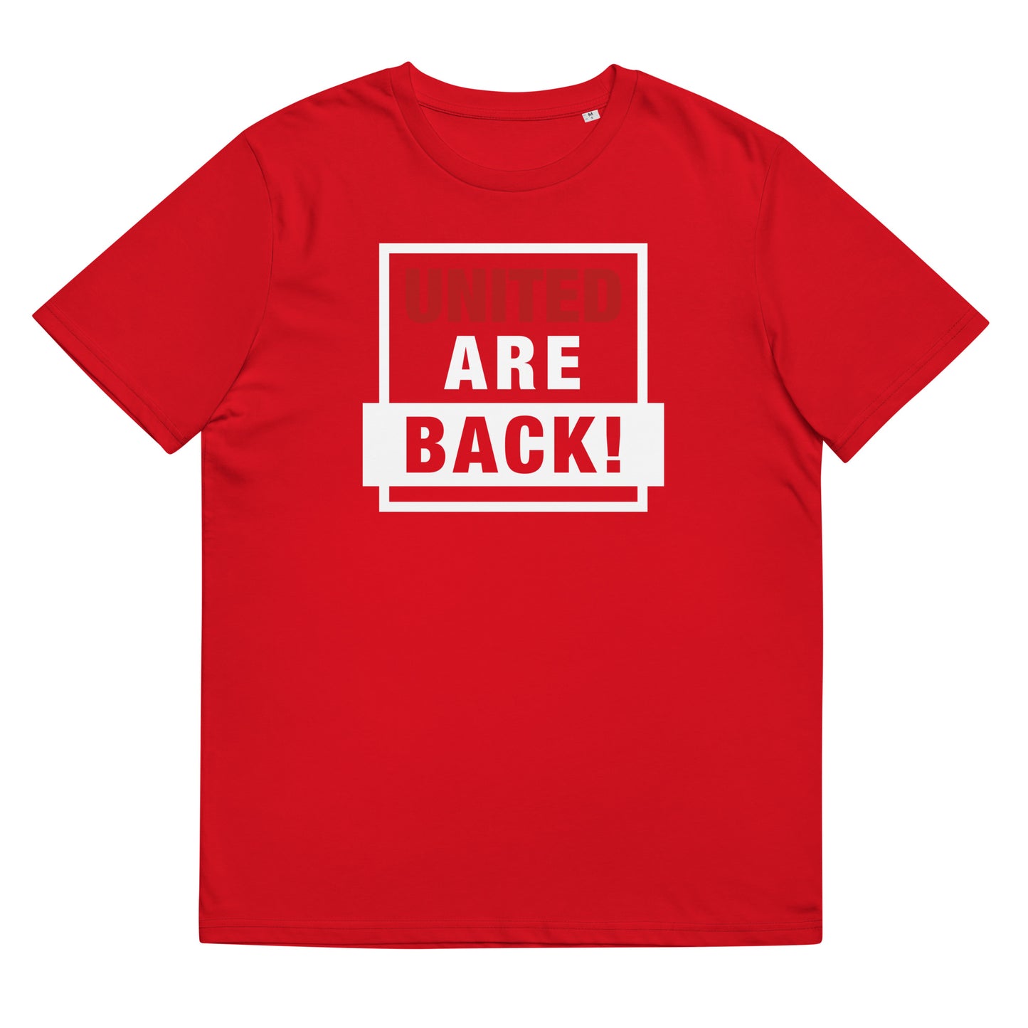 This unisex organic cotton t-shirt features a humorous 'United Are Back!' slogan in a square colour block and cutout design, with 'BACK!' taking on the exact colour of the t-shirt, whichever that colour may be.