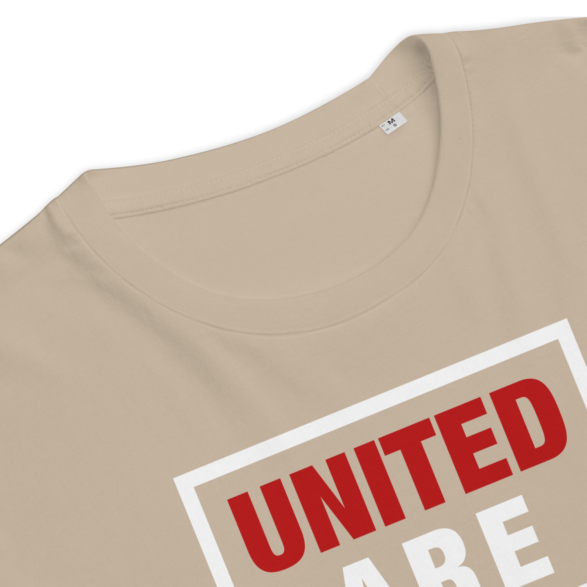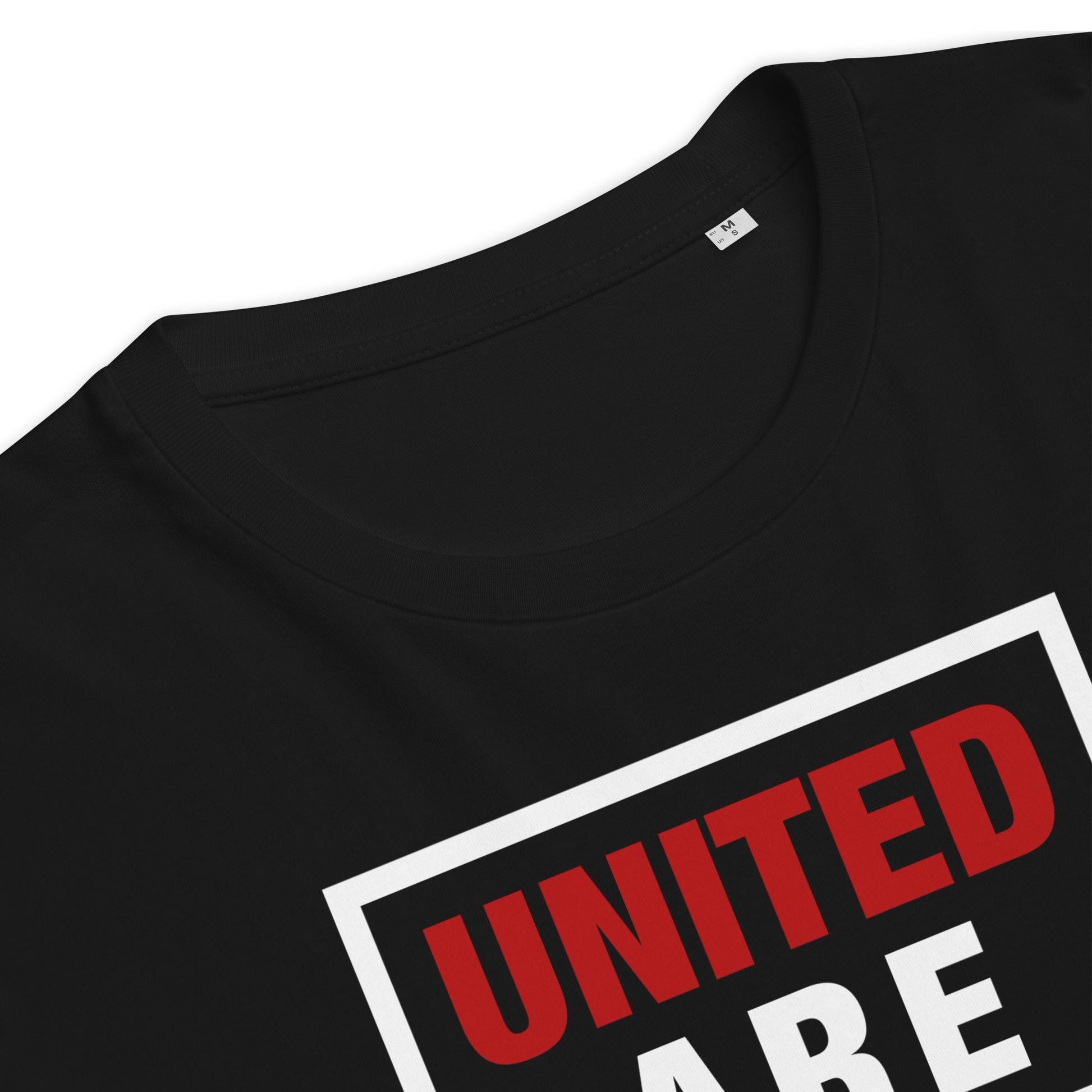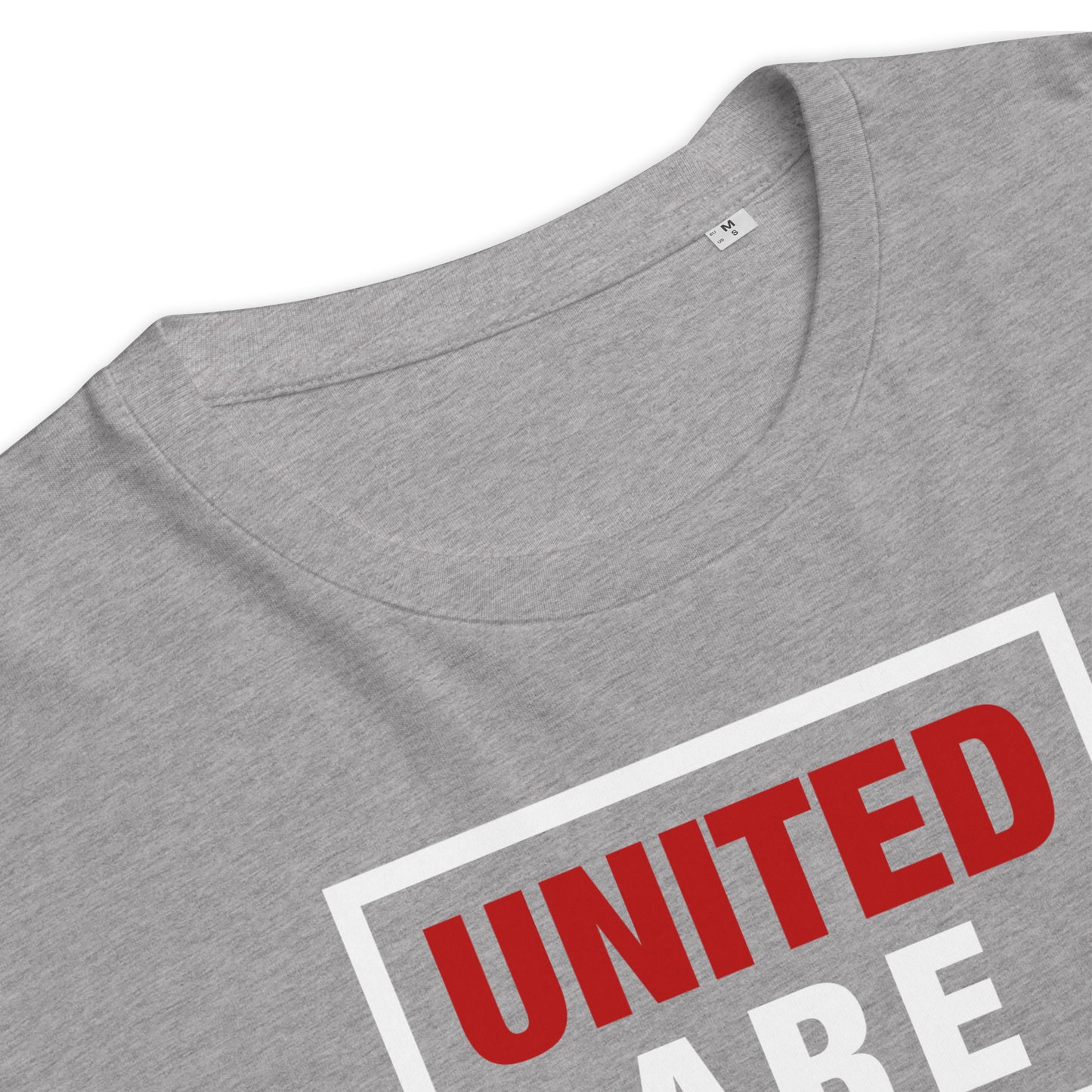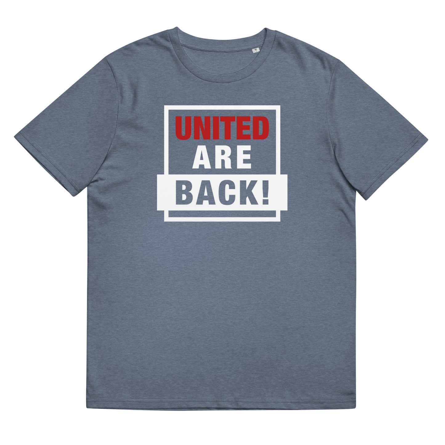 This unisex organic cotton t-shirt features a humorous 'United Are Back!' slogan in a square colour block and cutout design, with 'BACK!' taking on the exact colour of the t-shirt, whichever that colour may be.